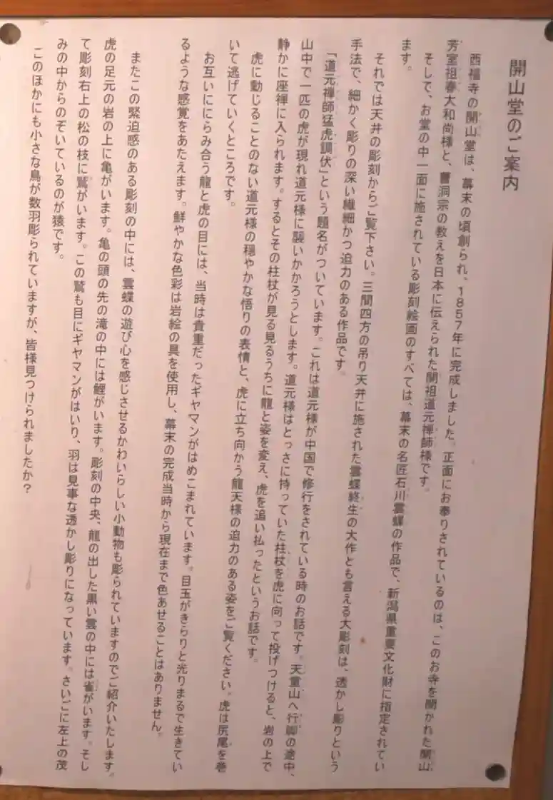 「大龍和尚は雪深く貧しい農村地域の 人々の心のよりどころとなるよう、雲蝶に開山堂の彫刻や絵画の制作…