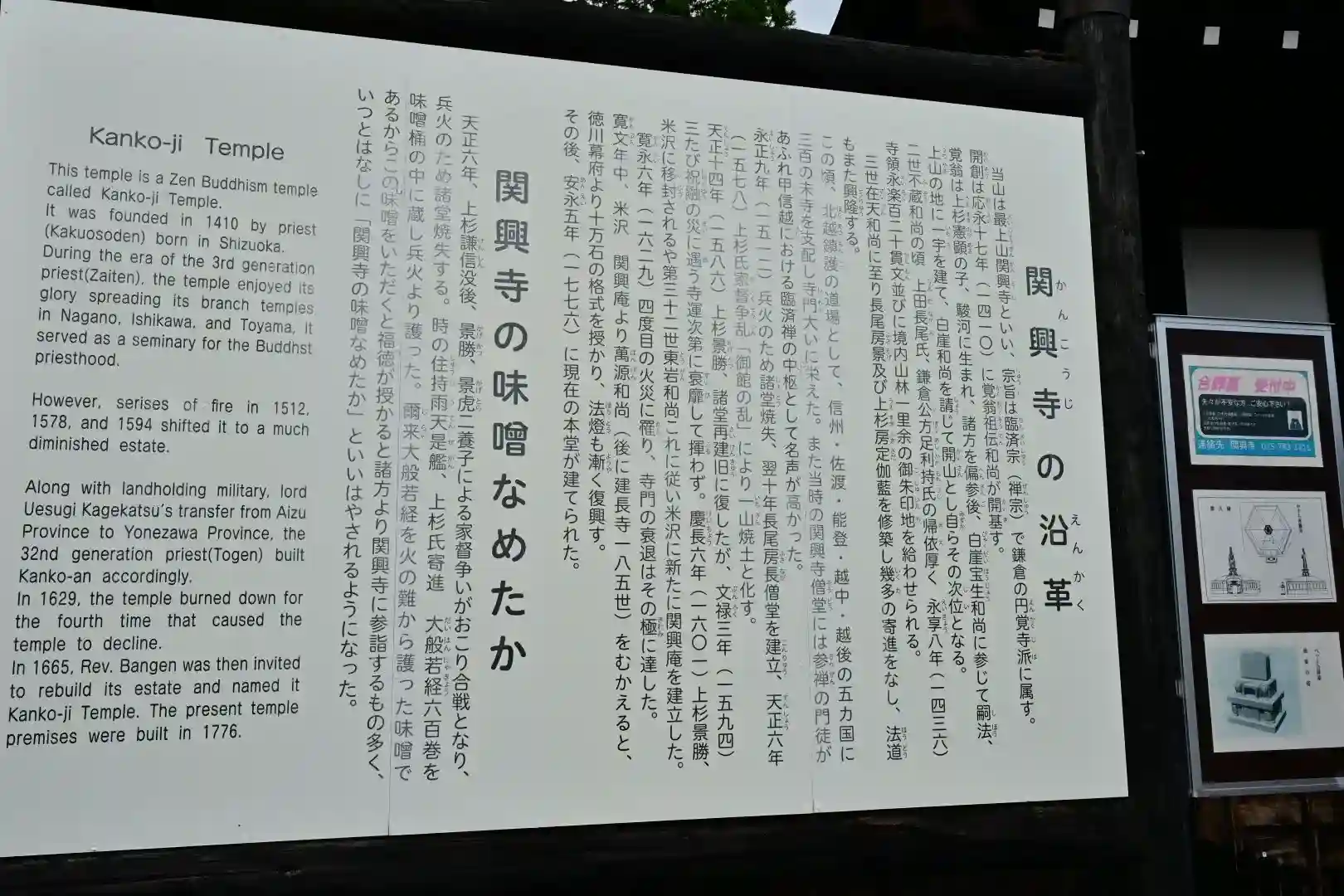 昔は関興庵と呼ばれ、関東官領上杉家の禅寺 かなりの広範囲を収めていました そして修行僧のために、沢山の味噌を作り蓄えている越後の味噌寺でもありました 上杉謙信死後の「御館の乱」で寺を焼かれましたが、上杉氏寄進の大般若経六百巻を味噌の中に入れ火災から守り抜きました 大難を逃れたことから、御利益の意味合いもあり「関興寺の味噌なめたか」と言われるそうです