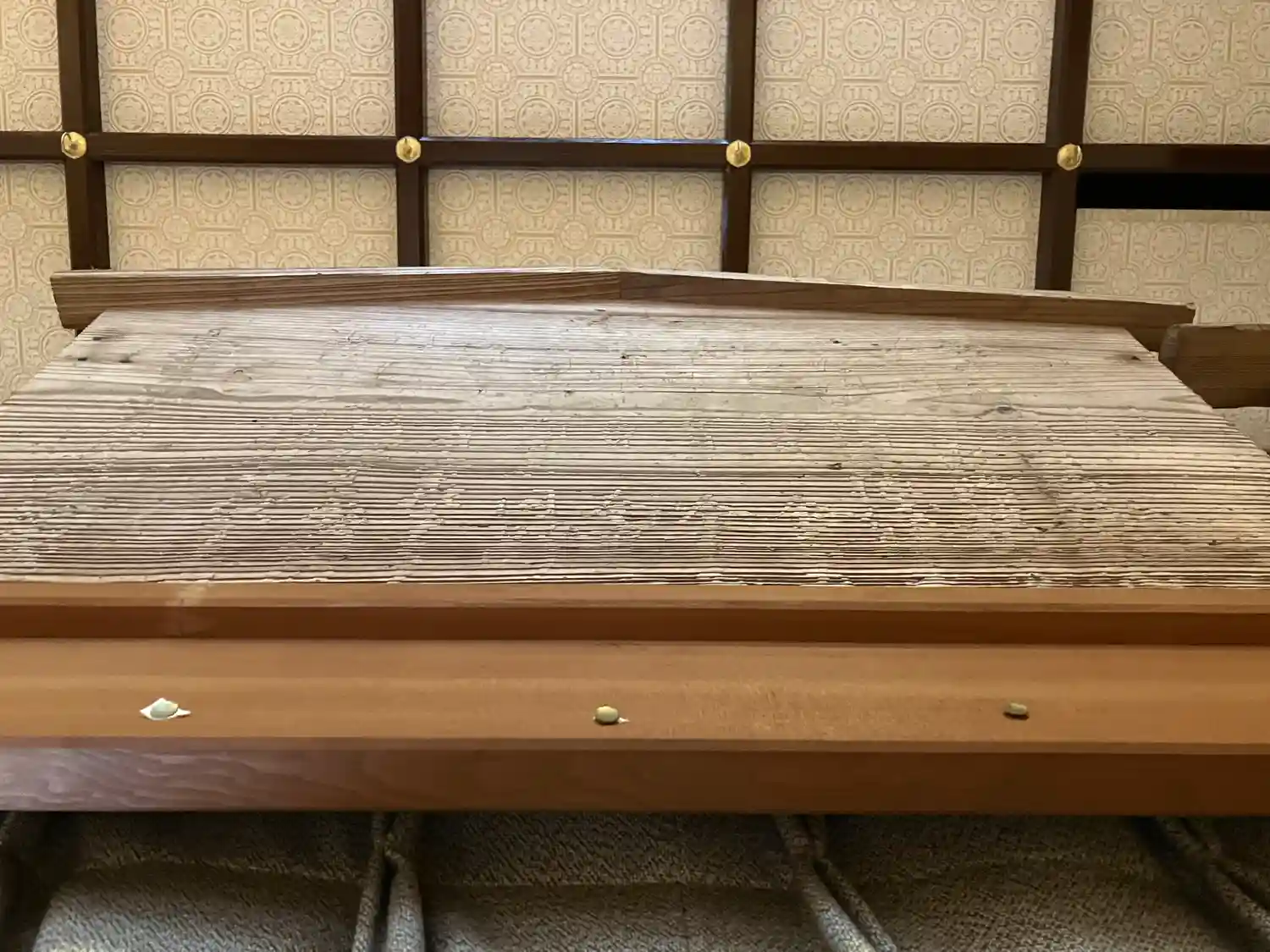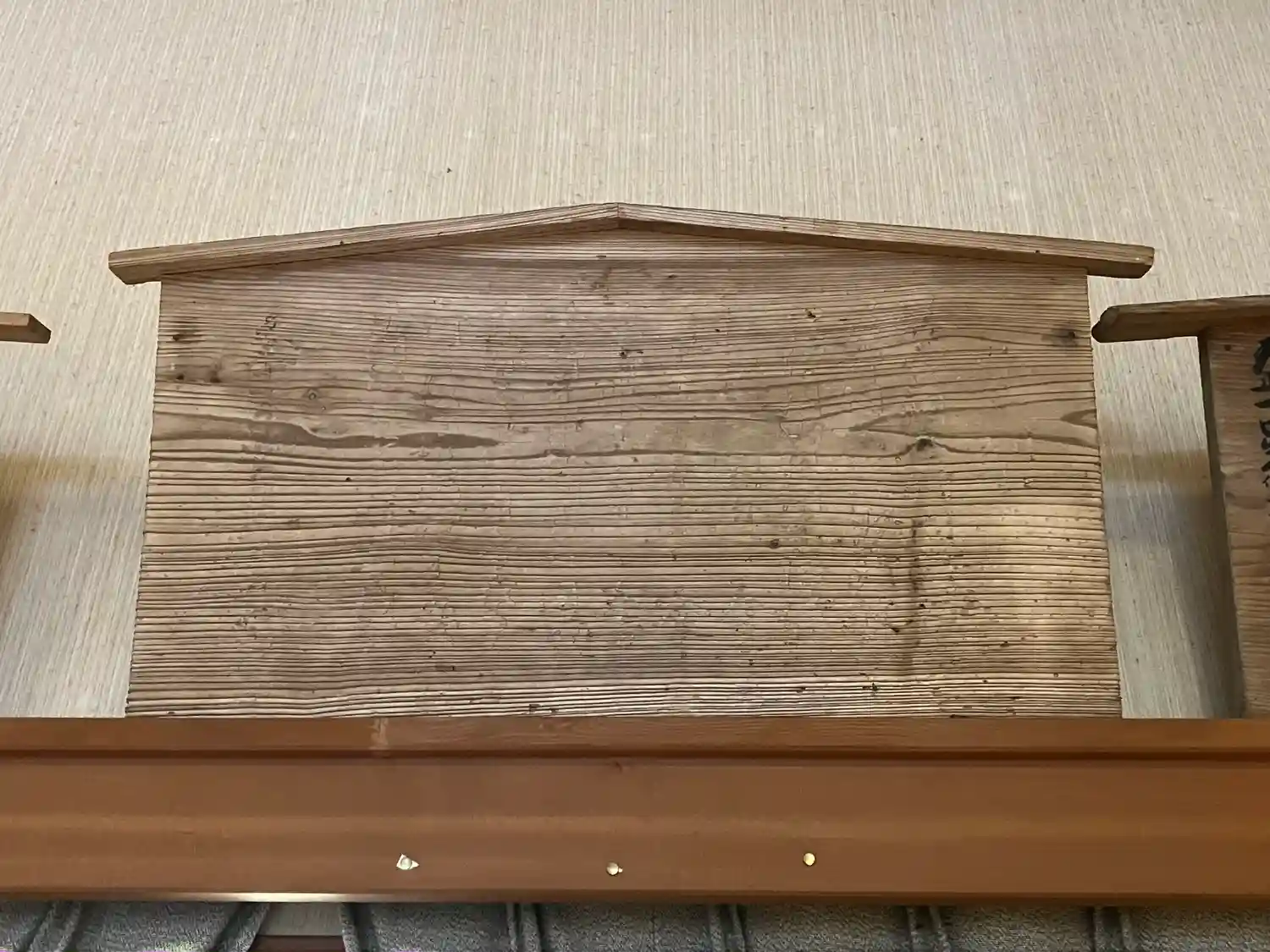 直江兼続制札(墨が消えているが下から見ると文字があった所が浮き上がっているというが、下から見てもよく分からない)