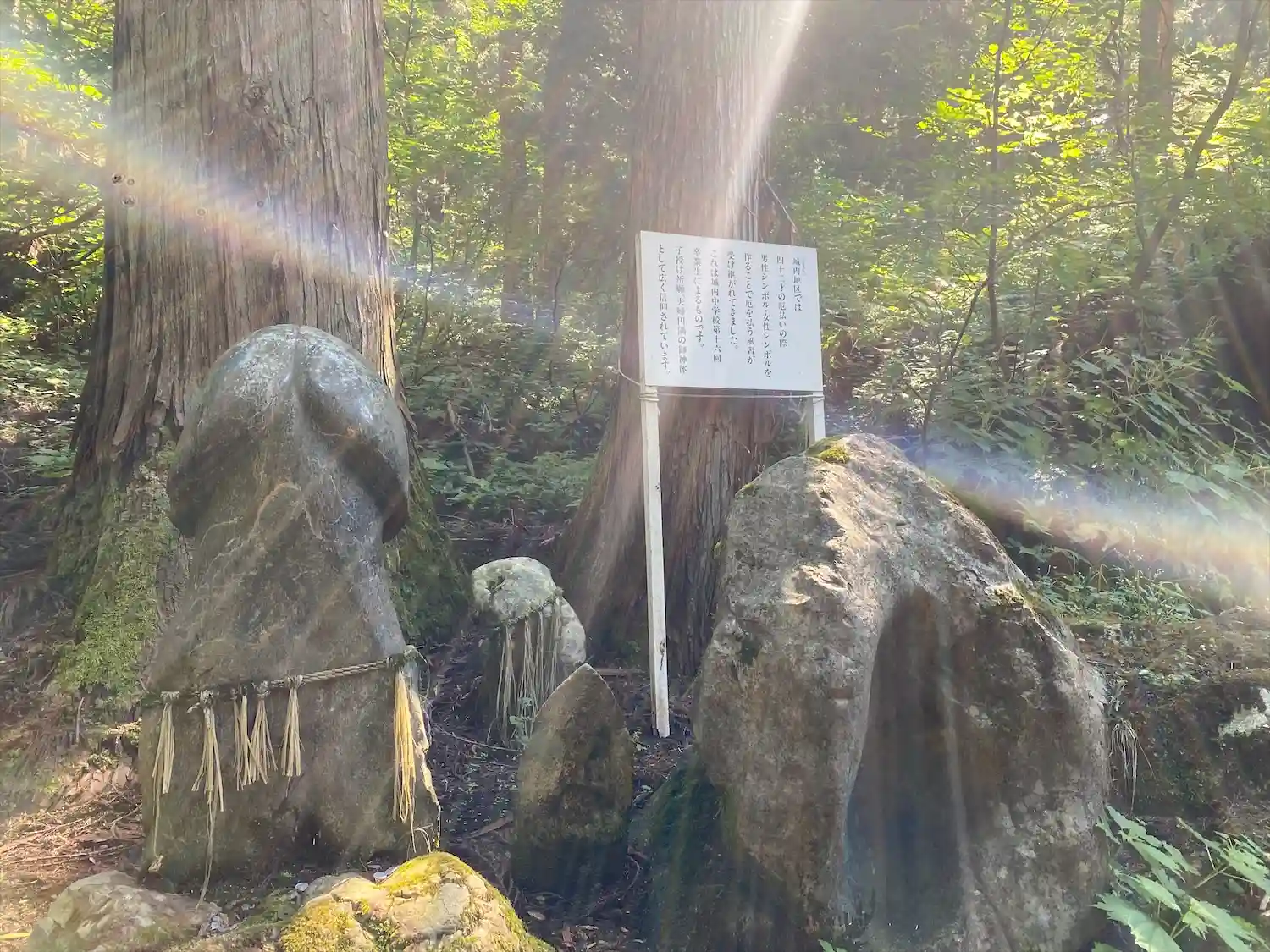 本殿脇のから下に降りるところあり、瀧の側に男性、女性のシンボルがある