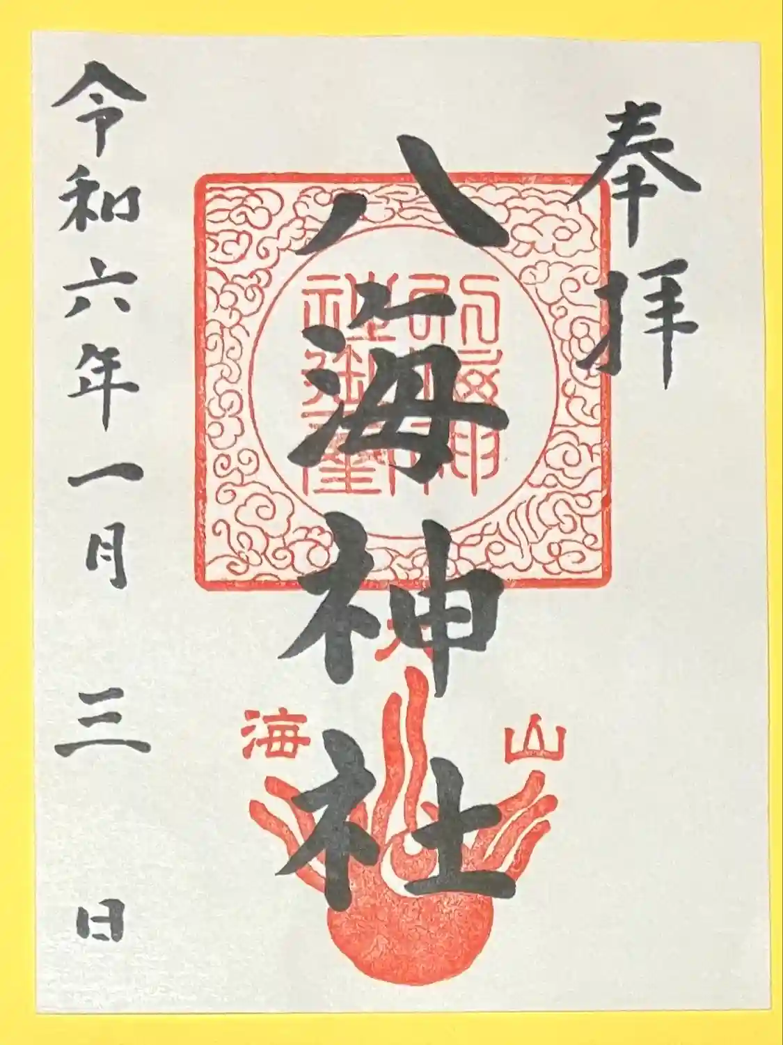 八海神社です。宮司さんはおらず、御朱印は書き置きでした。