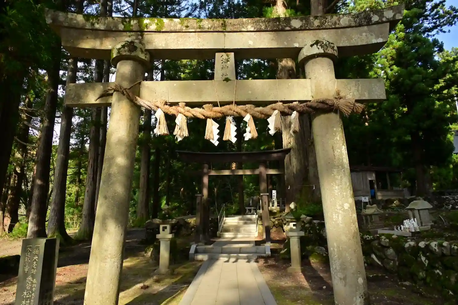 一の鳥居から二の鳥居までの杉並樹の参道が心地よい。境内にも大きな杉の御神木がそびえ立つ。神池に水神…