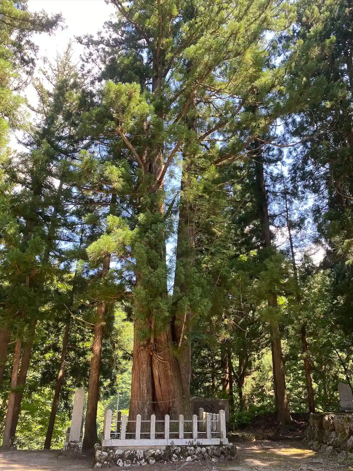 一つの根から二本の幹が伸びる杉。