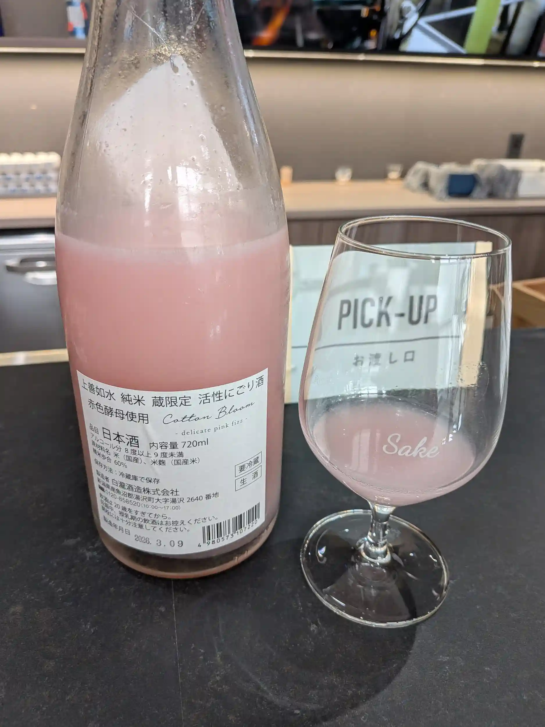 近くの白瀧酒造限定の『上善水の如し 純米 蔵限定 活性にごり酒 赤色酵母使用』が、ピンク色で珍しくかなり美味しかったです!もちろん購入。車だったら、何本も購入したかった。購入時のビニール袋もお米から作られているとの事でした。