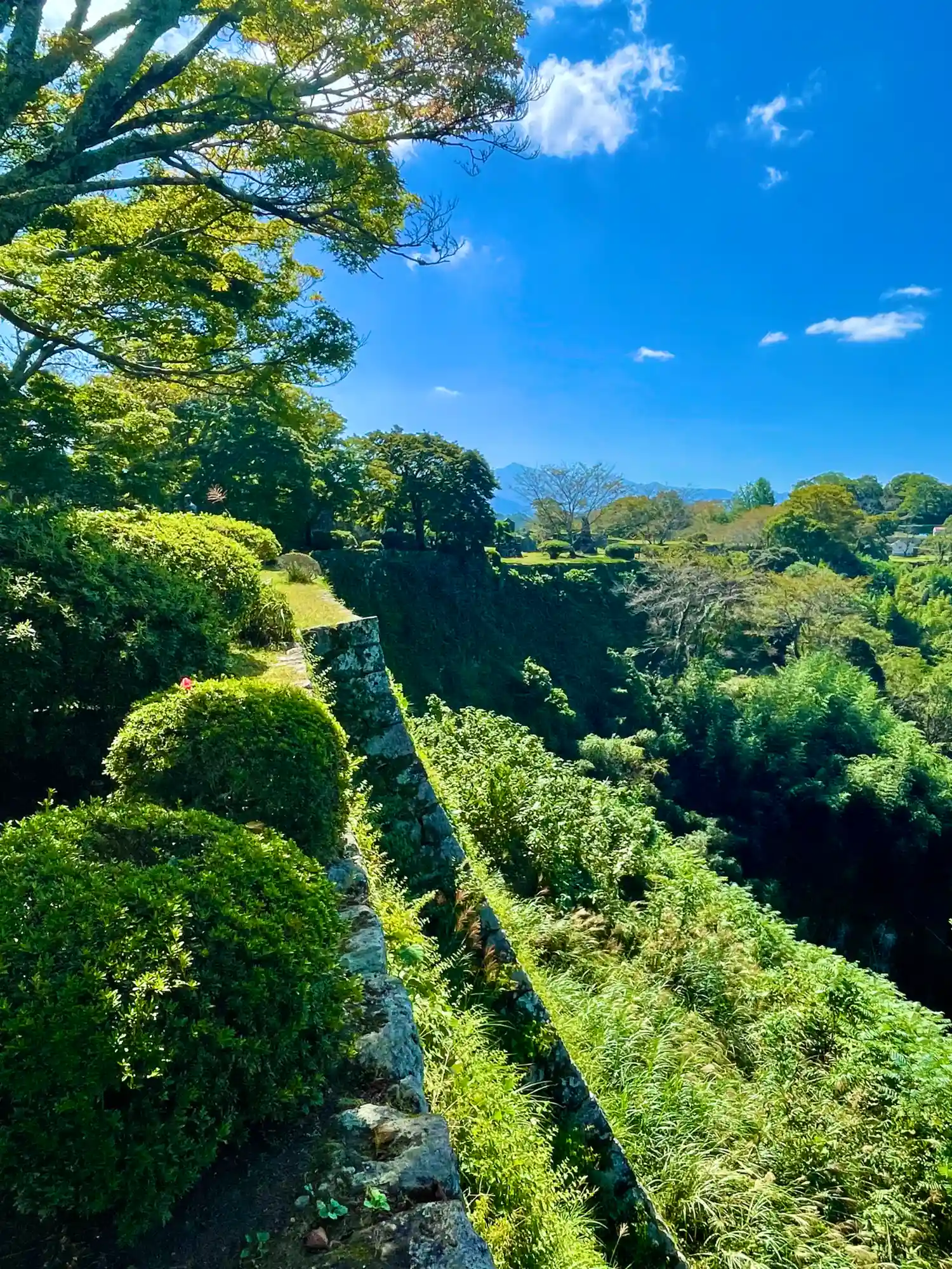また、岡城跡からは阿蘇山やくじゅう連山を望むことができ、高石垣は燃える夕焼けや雲一つない青空の下で様々な表情を見せます。
