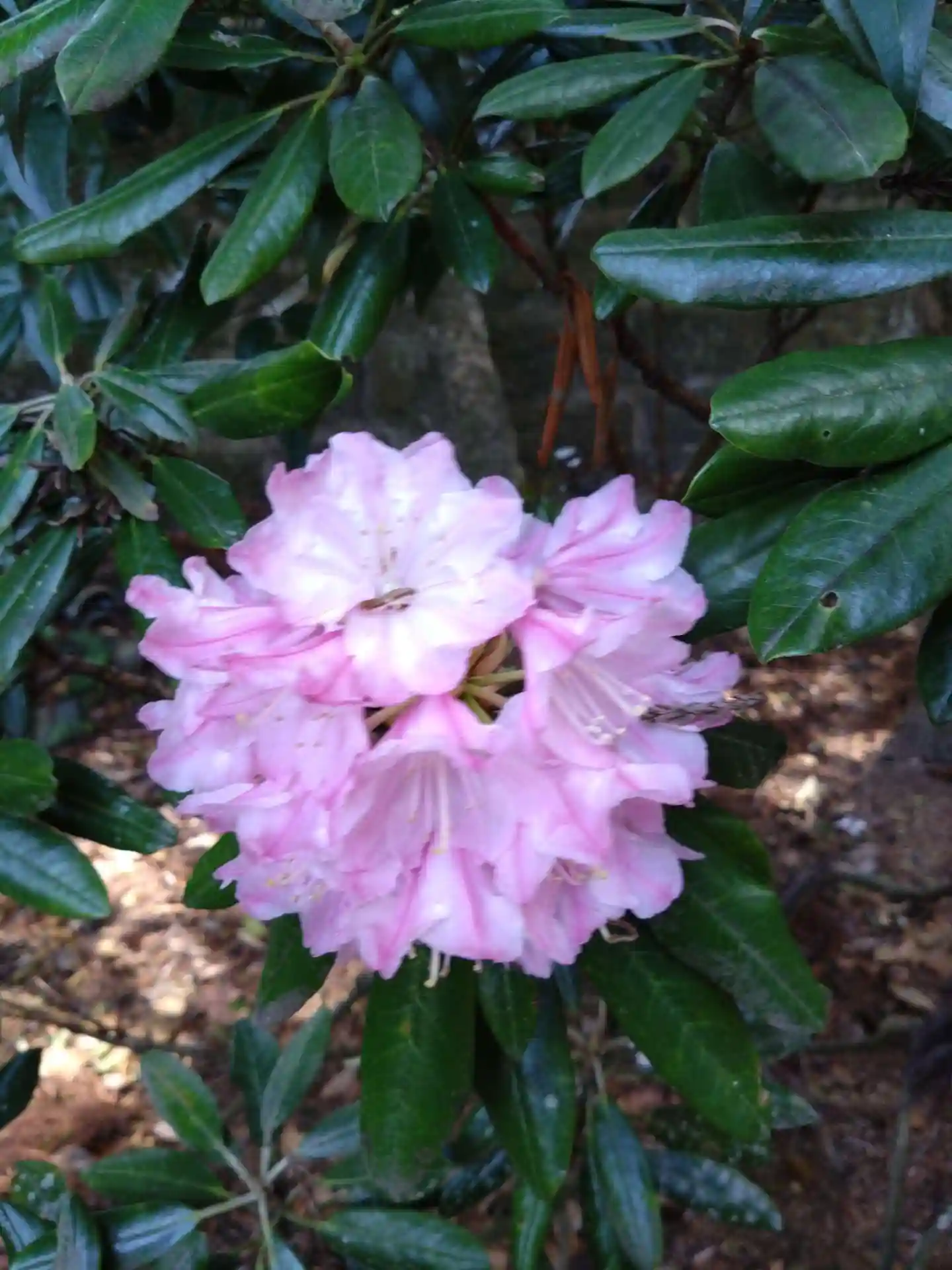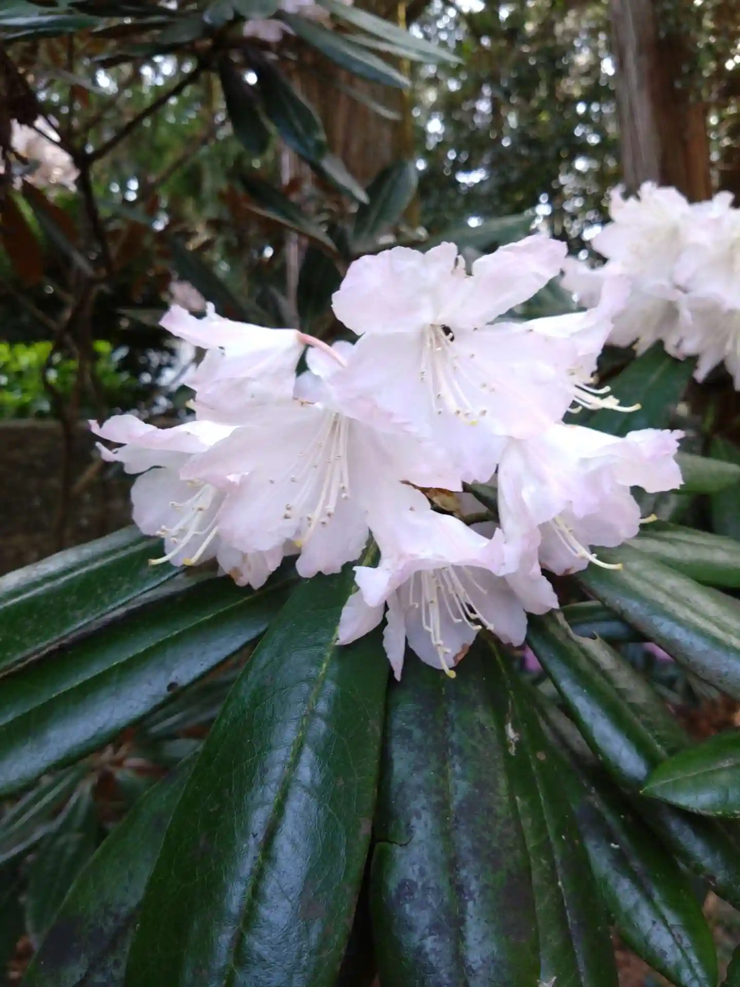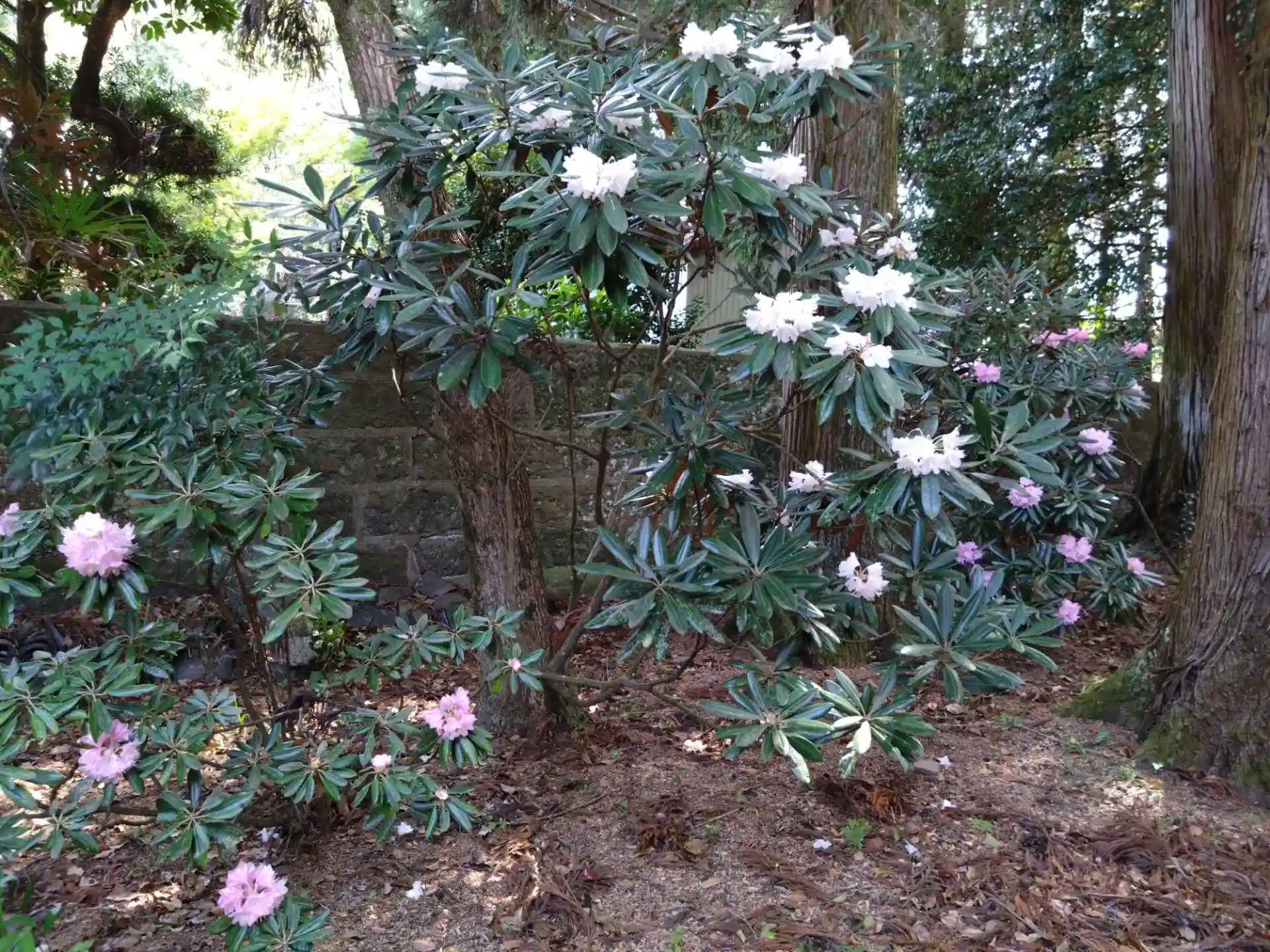 拝殿横に白とピンクのシャクナゲがきれいに咲いていました。