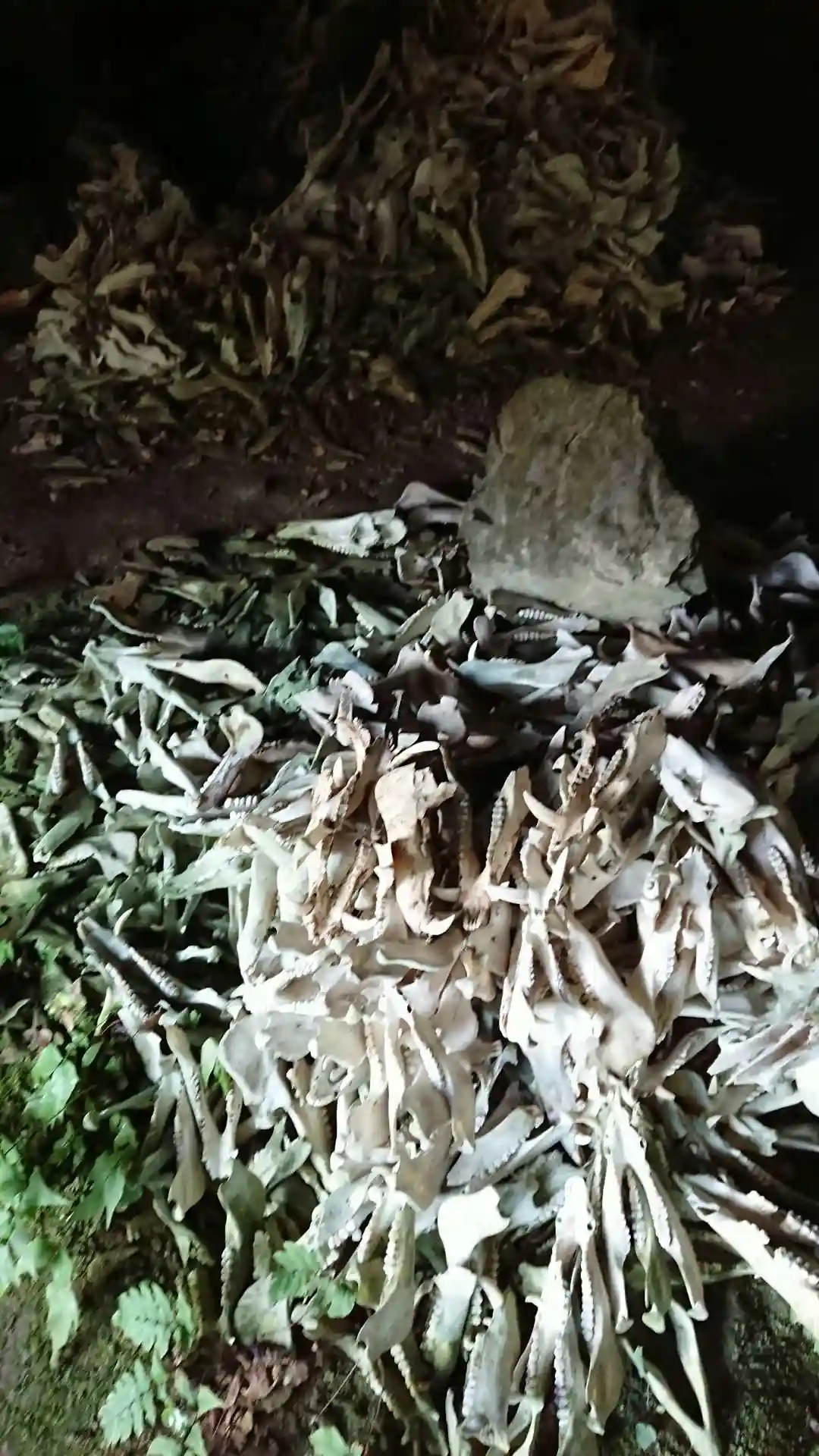 約30mぐらいの崖を鎖を使って登ったところに洞窟があり、無数の鹿や猪の頭蓋骨が奉納されています。
