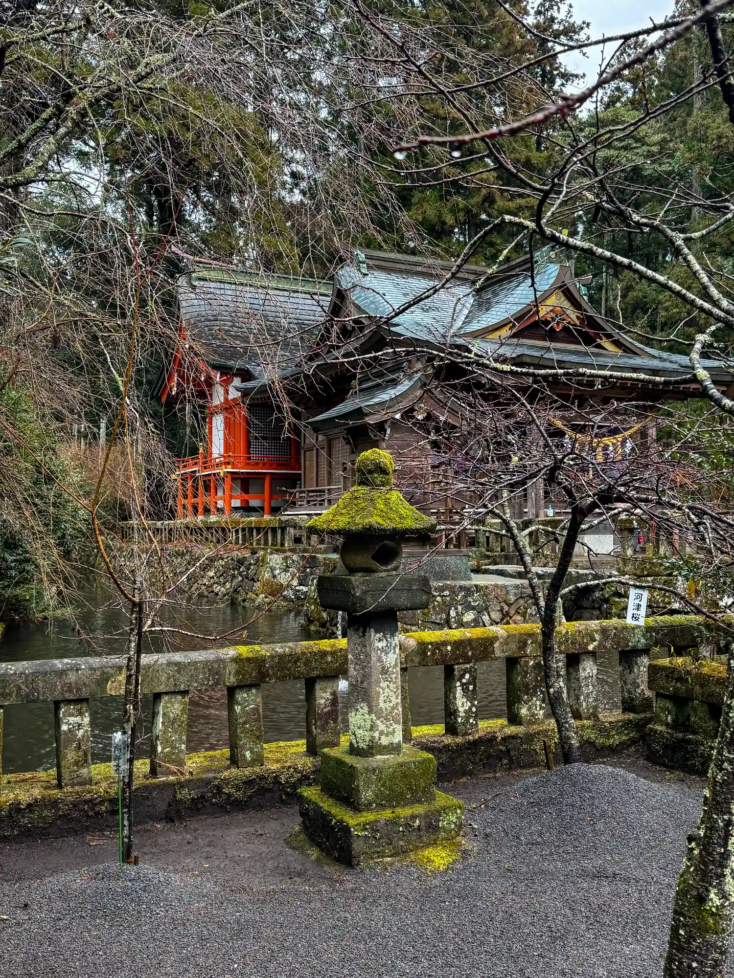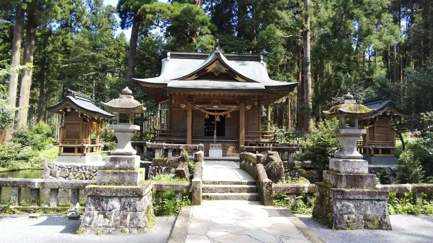 拝殿の周囲は堀になっており、橋で繋がっている状態です。当社の伝承に御祭神のウナキヒメさまが大男に命じて由布院盆地の湖に岸辺を蹴破らせて水を抜いて盆地にしたというものがあります。