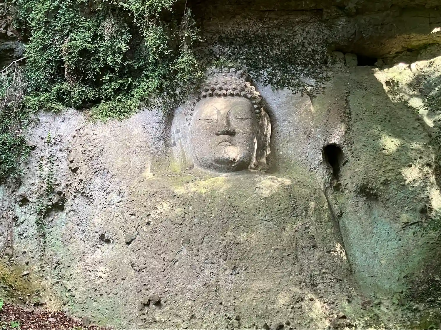 "熊野磨崖仏"にお会いできます。まず、"柔和な表情"をした不動明王さま。もう少し頑張って上がっていくと大日如来さま。誰がどんな目的で岩を彫ったのか🤔 しばらく見惚れてしまいました。