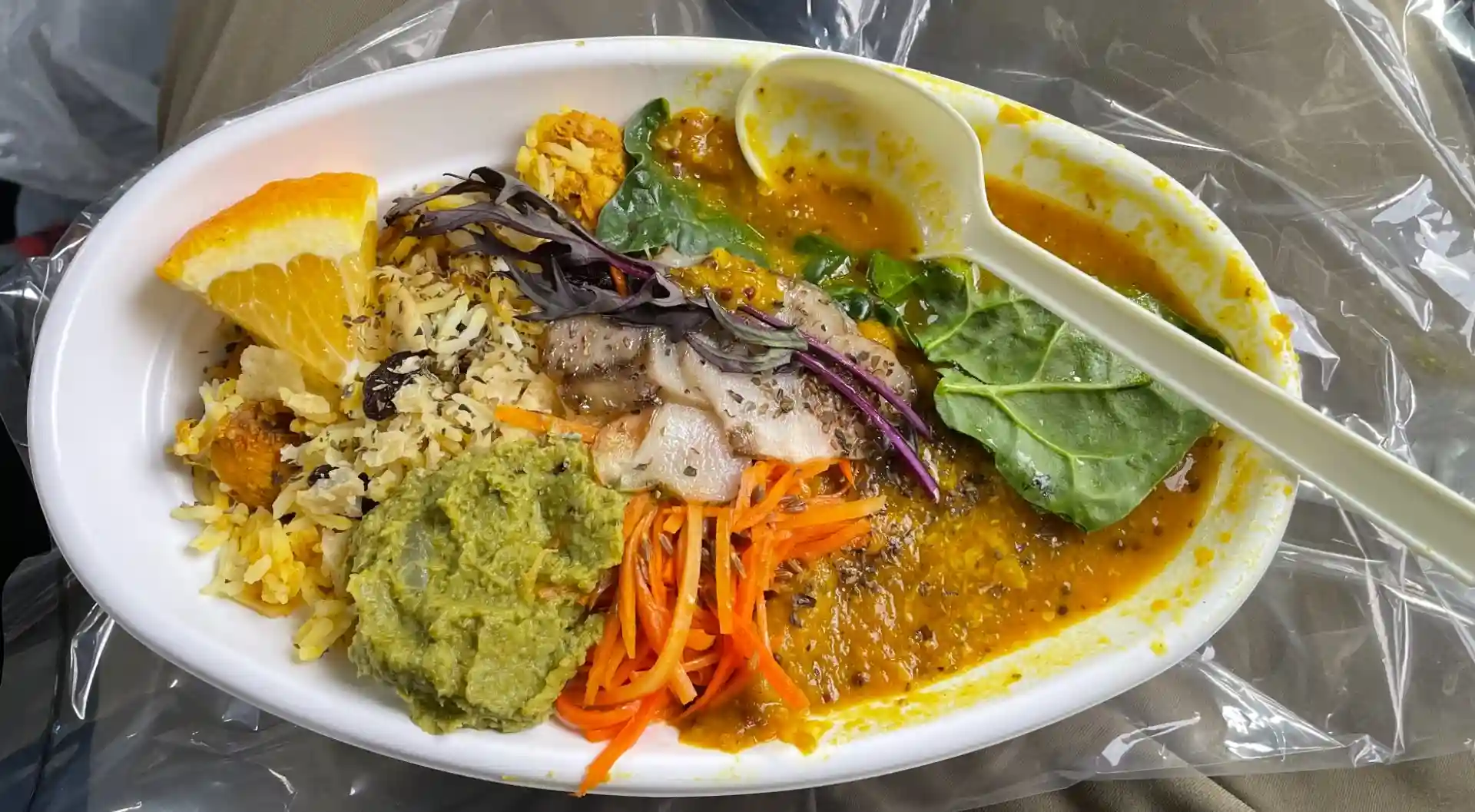 御朱印を頂きにあがった際にカフェからカレーの匂いが… ランチでテイクアウト🥡出来るとの事でオーダーしました😉 想像したカレー🍛ではなく小洒落たエスニック風のインディカ米を使った本格派ランチで近くの漁港駐車場で車内でいただきました😉 多分皆さんも書き置き御朱印いただきにまいったらカレー注文すると思います😉