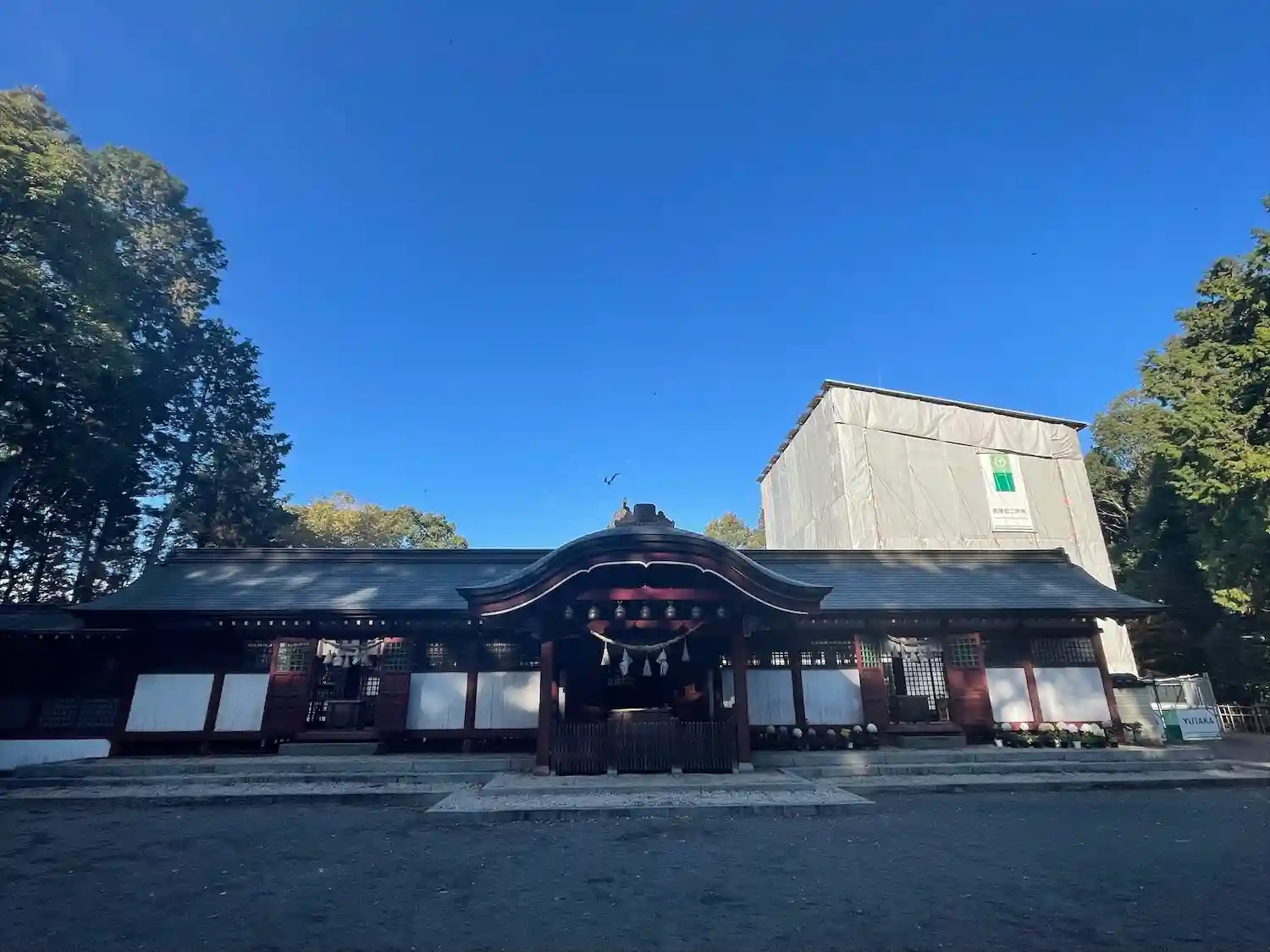 拝殿 右手のシートが掛かってるのは工事中の神門。