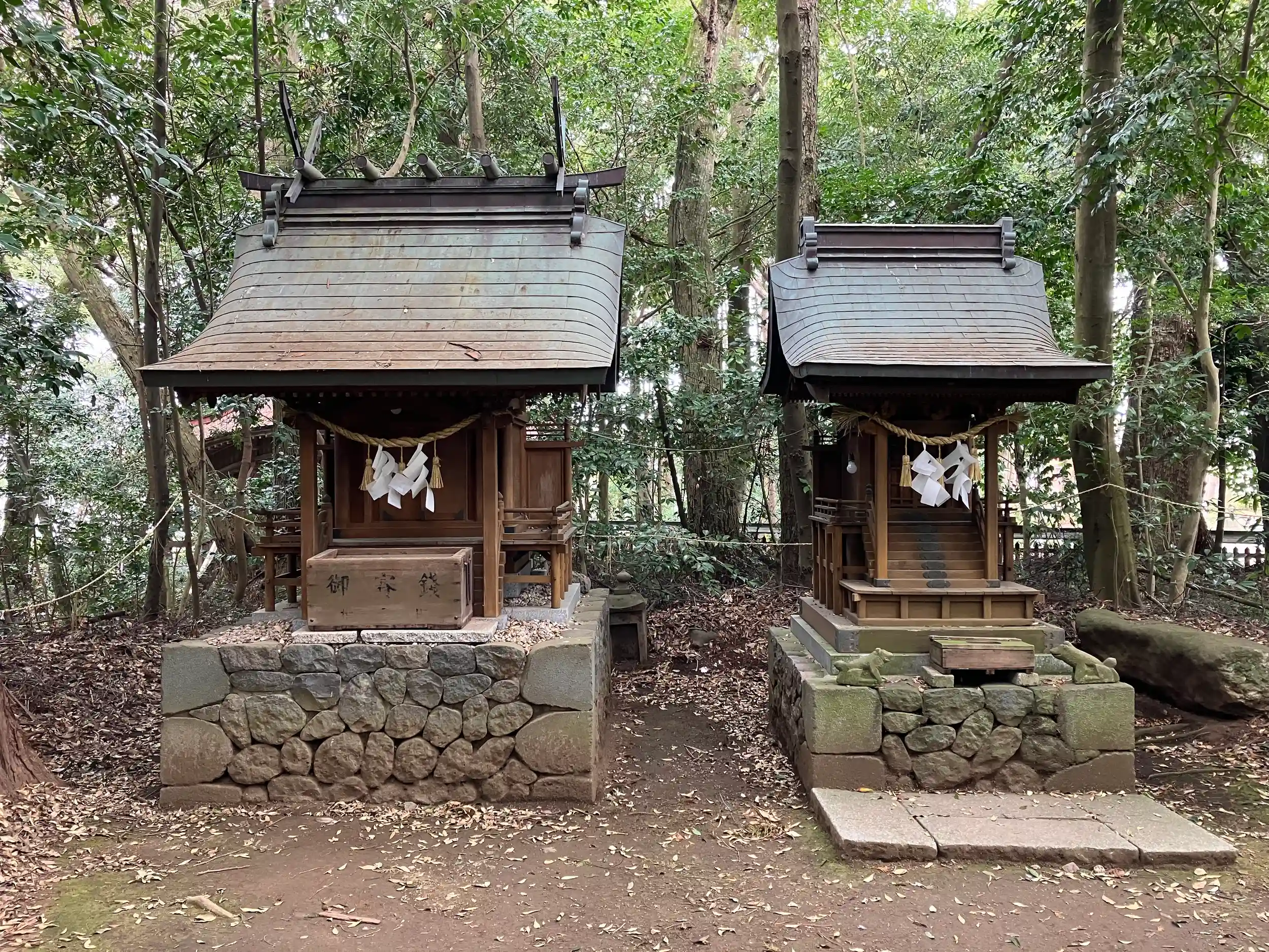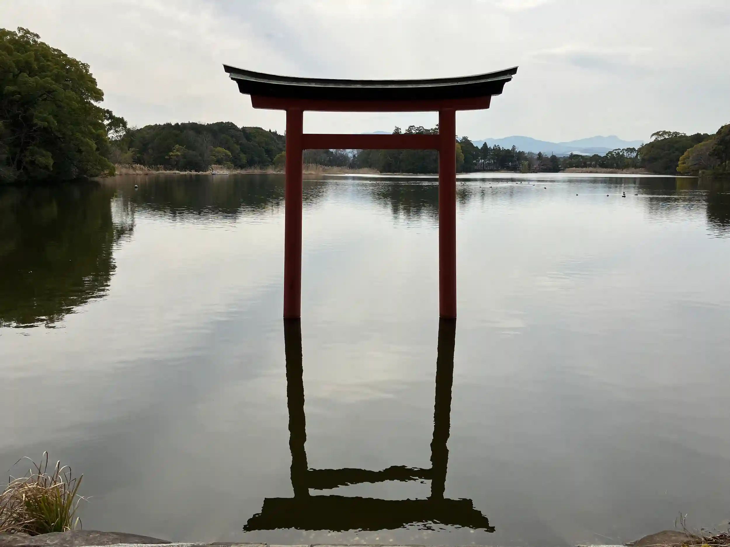 社殿の西に広がる三角池を神体とし、池を内宮、社殿を外宮と称する。