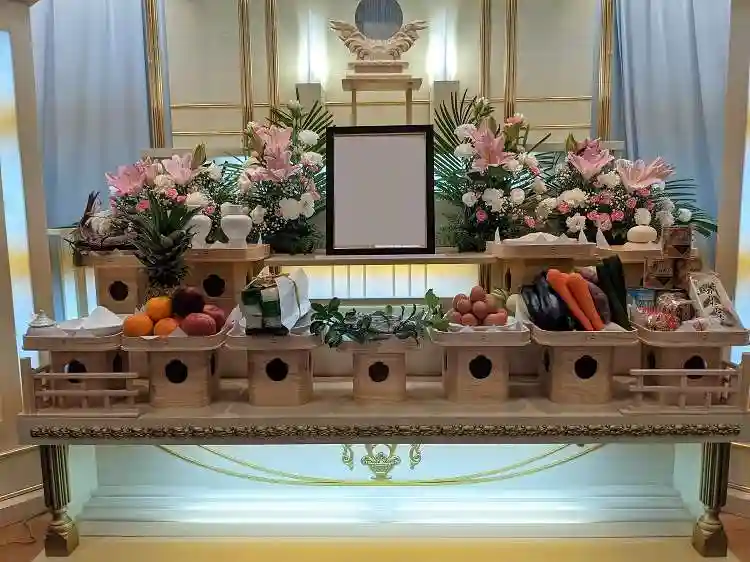 祭壇は各葬儀社で相違はありますが、お供えはこのような形で神社にお供えしてある物と相違はそこまでありません。