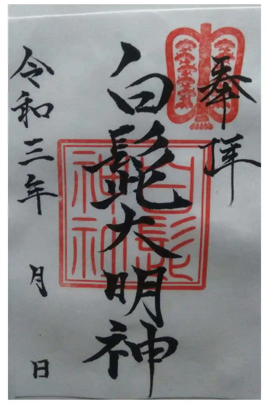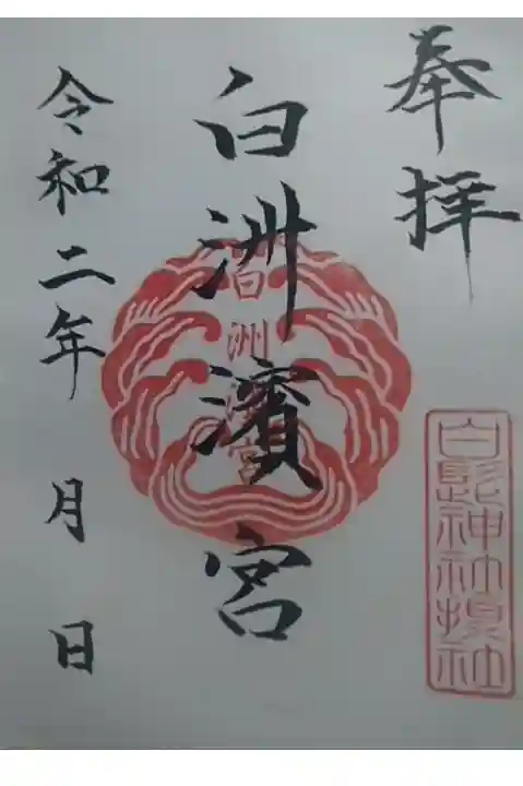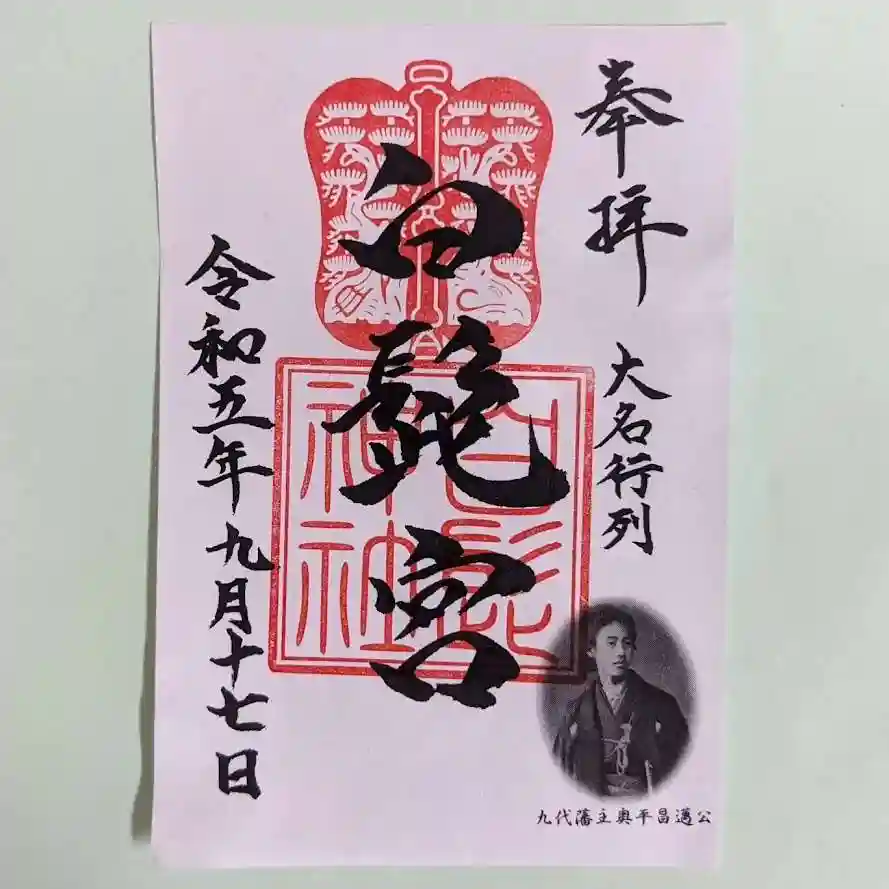 白髭大明神 奥平家より使用を許可された中津団扇の社紋とシンプルな御朱印。