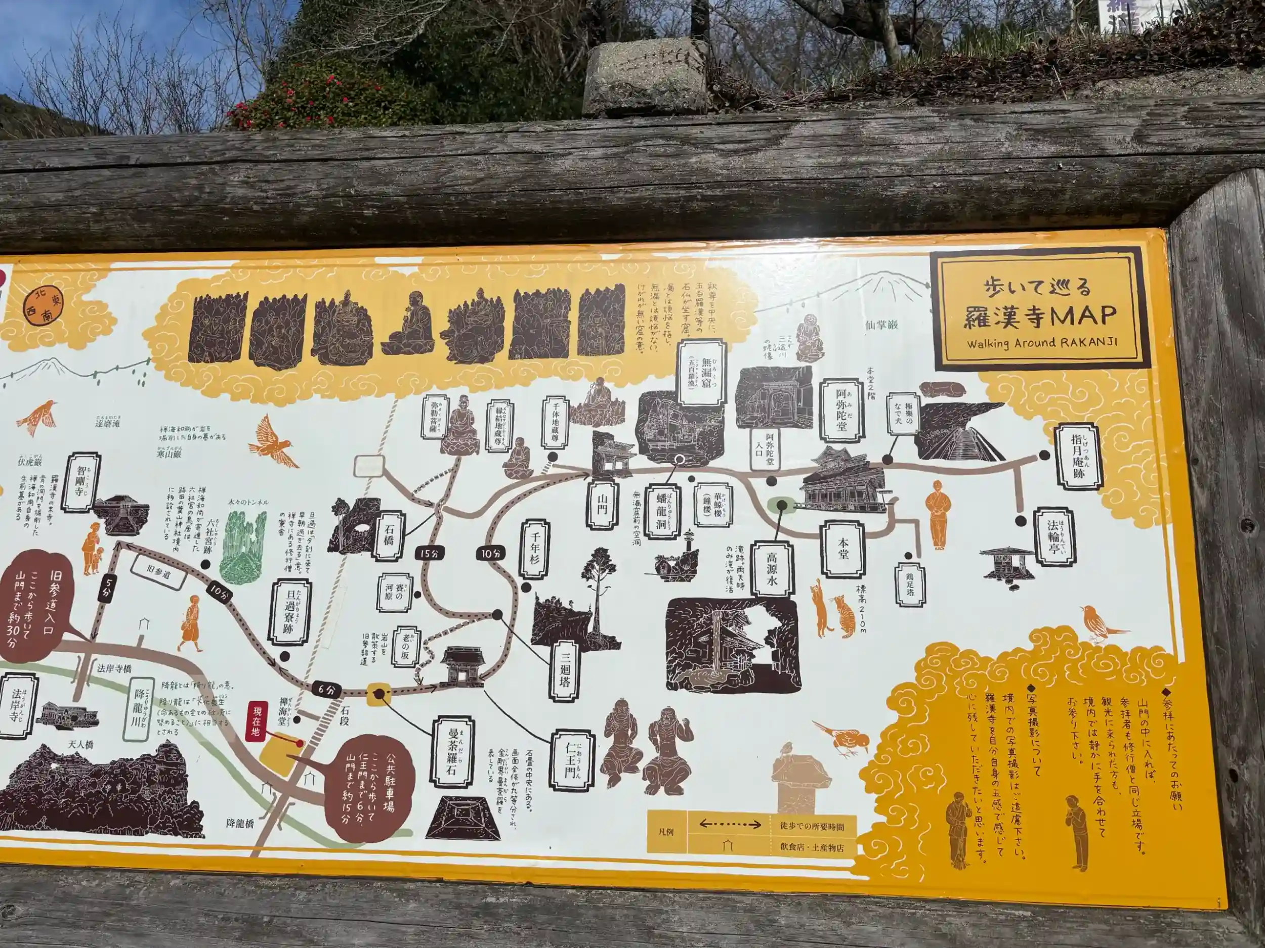 境内撮影禁止。入山するためにはルールが複数あります。登山に匹敵するため、本堂まで登るのは大変ですが、素晴らしい景色に日本最古と言われる羅漢像と見応えがあります。記念に購入したミニ般若心経本は、裏に現代語訳でそのまま読めるようになっており、おすすめです。