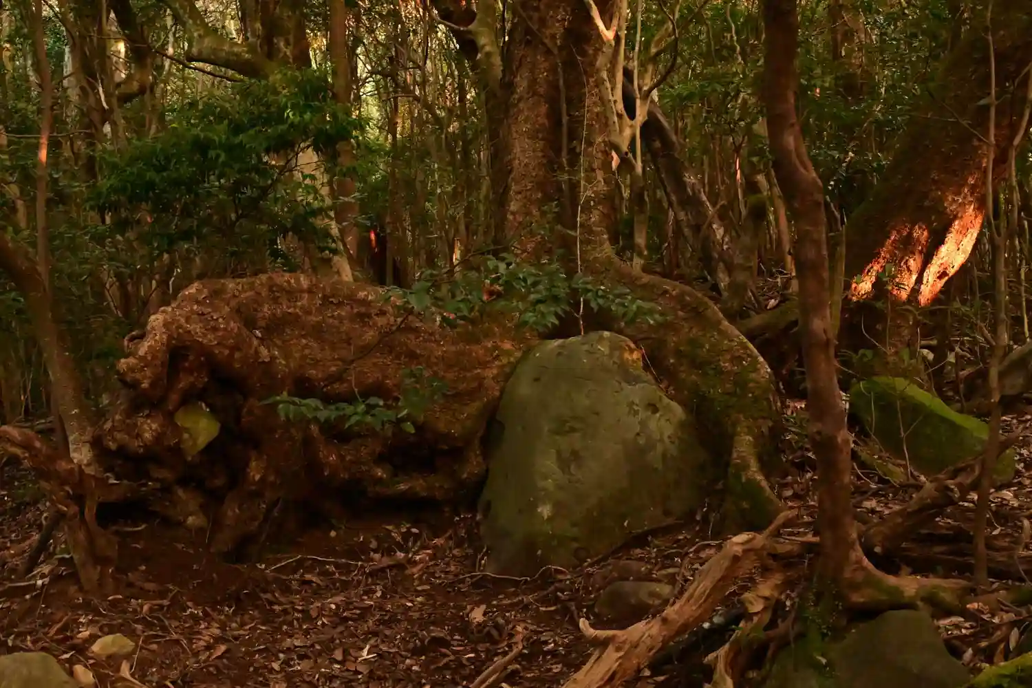 木が石を抱きかかえている様子が龍のようにも見えます。