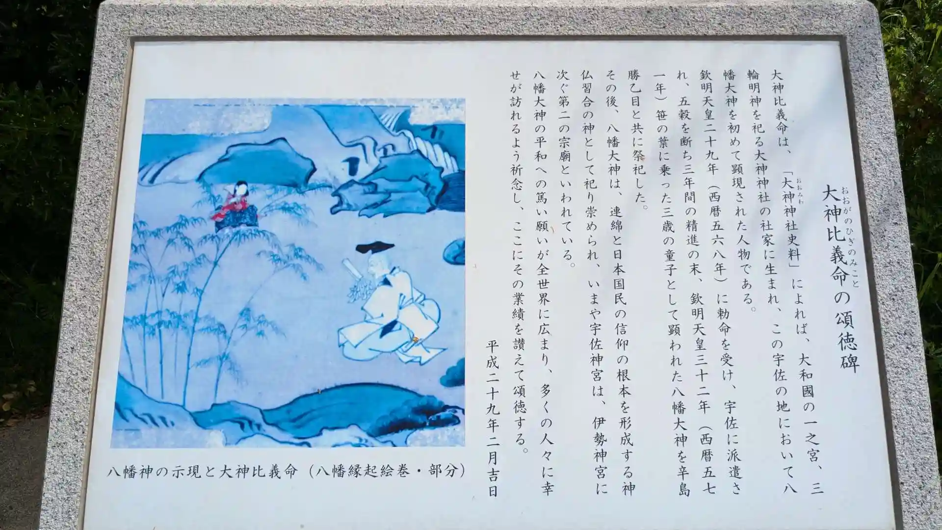 大神比義は宇佐の地で八幡大神を初めて顕現(見た)された人物で宇佐神宮の初代大宮司。その際の八幡大神は笹の葉に乗った三歳の童子の姿で現れたそうです。