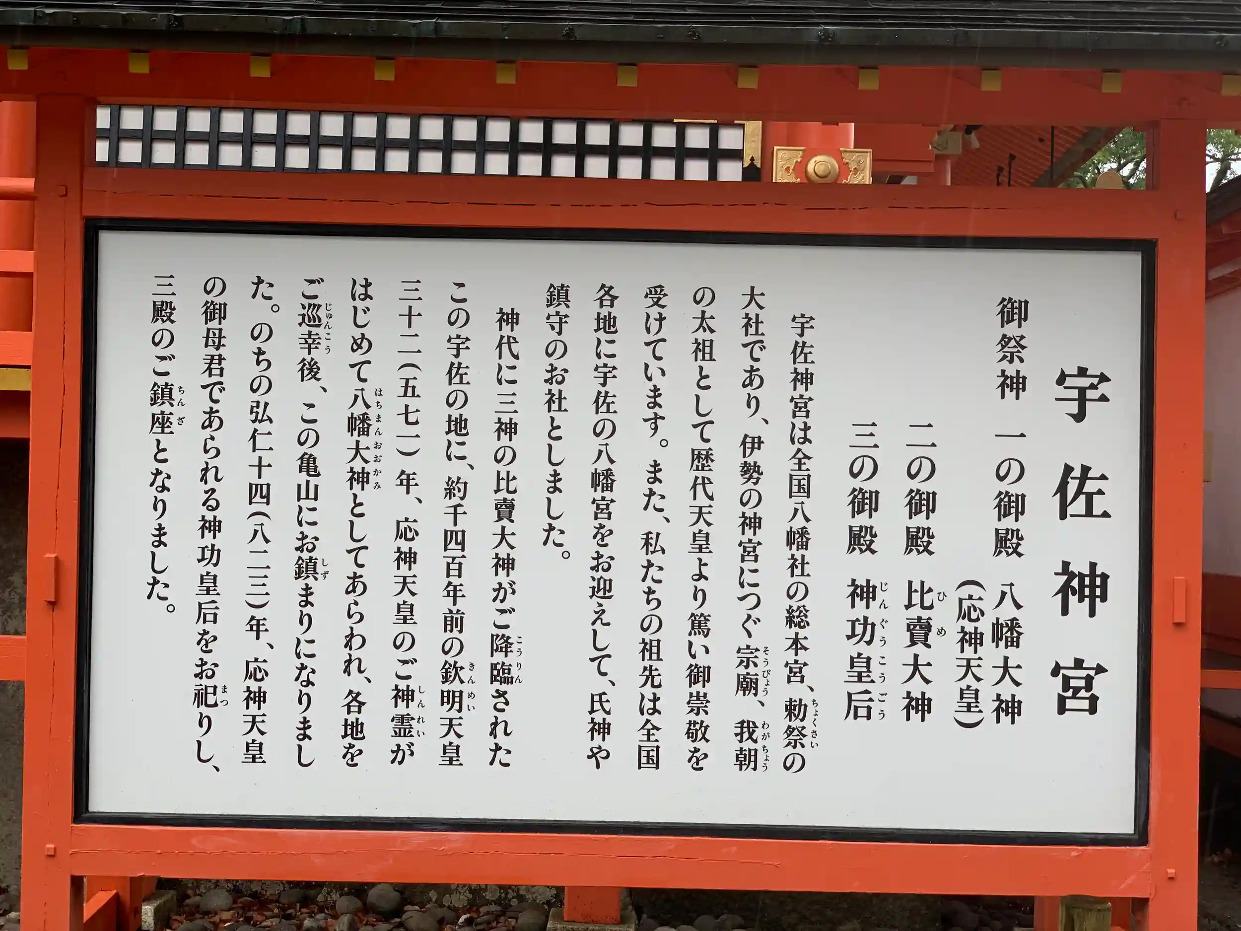 御祭神である八幡大神さまは応神天皇のご神霊で、571年(欽明天皇の時代)に初めて宇佐の地に ご示顕になったといわれます。応神天皇は大陸の文化と産業を輸入し、新しい国づくりをされた方です。725年(神亀2年)、聖武天皇の勅願により現在の地に御殿を造立し、八幡神をお祀りされました。