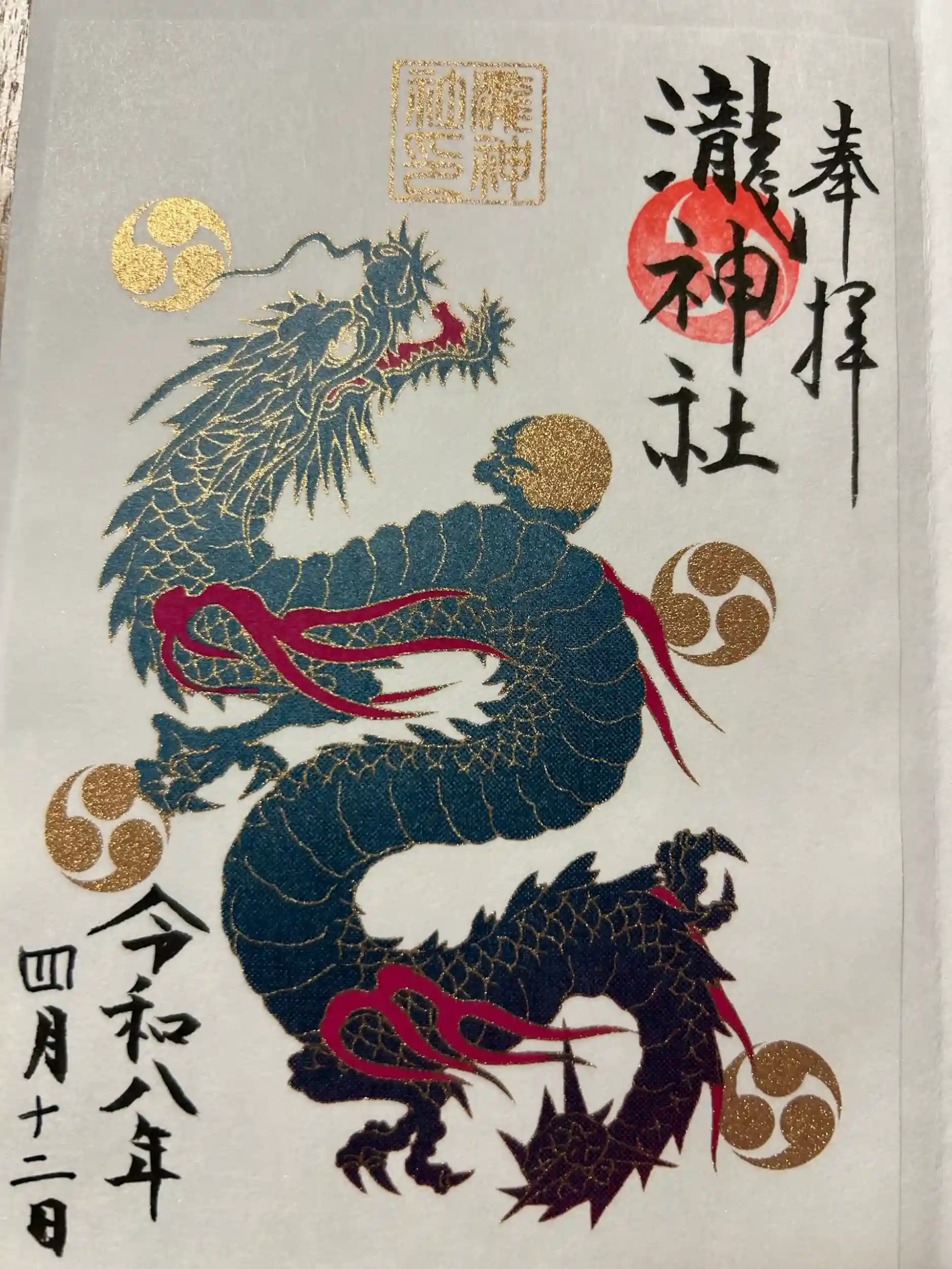 参拝と御朱印いただきました。嵐山瀧神社は、縁結びや諸願成就のご利益があるとされる神社で良縁を願って訪れる人が多く、特に女性に人気みたいです。また手水舎には、綺麗な花が美しく飾られ神社のすぐそばには、「三日月の滝」と呼ばれる滝があり滝の音を聞きながら参拝出来ます。御朱印は宮司さんが不在の場合は嵐山瀧神社の御朱印の置きが本殿にあります。初穂料が500円と800円があり、1枚1枚コピーではなく宮司さんが書かれているそうです。今回800円の龍の絵が書かれている御朱印をいただきました。龍の絵は絵師さんがデザインされ書かれ、宮司さんが文字を書かれていると言われました。とても良い御朱印🙆です。