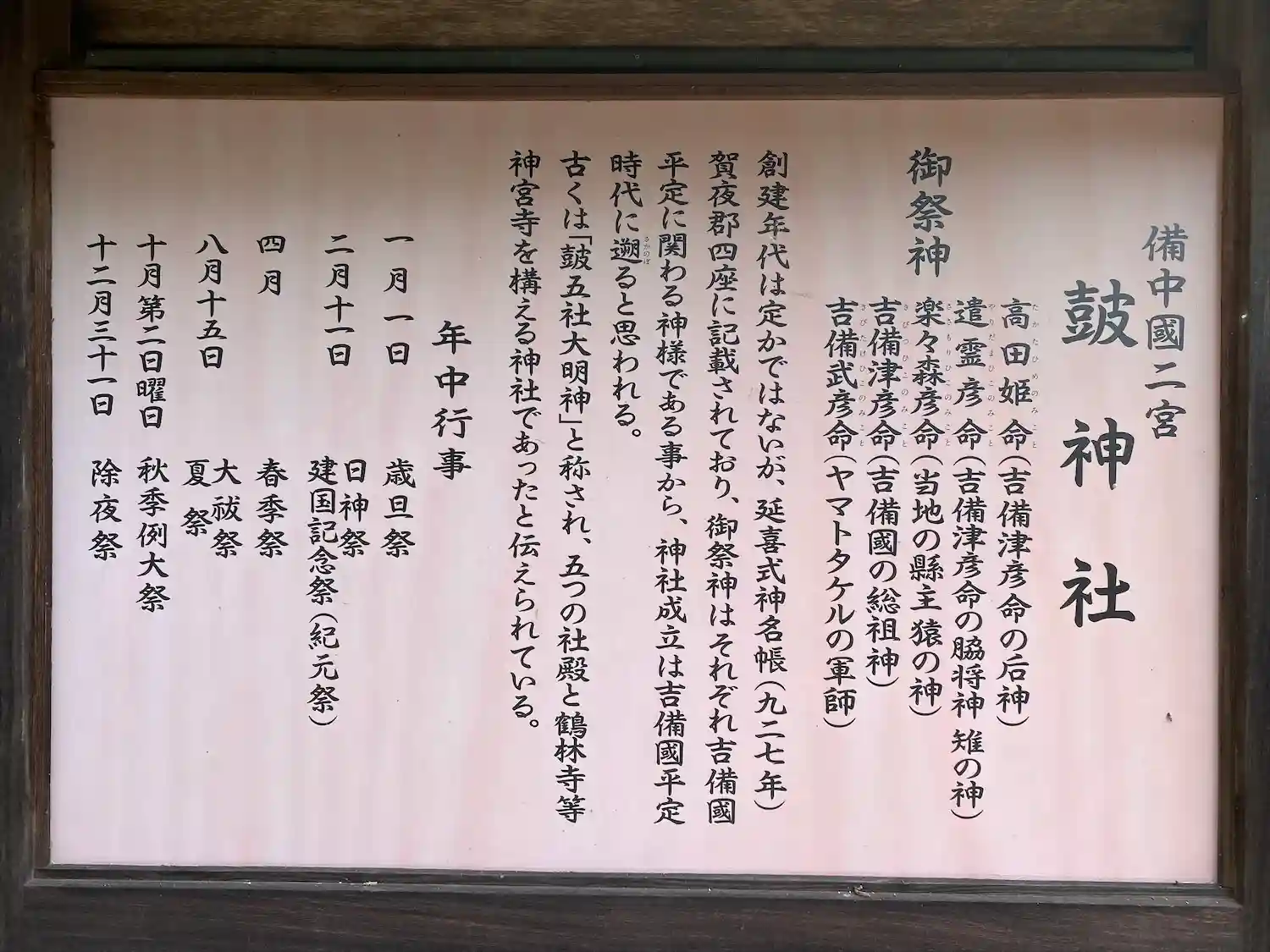 | ご祭神 | 《主》高田媛命,吉備津彦命,楽楽森彦命,吉備武彦命,遣霊彦命《合》天穂日命,大名持命,太玉命 | |
