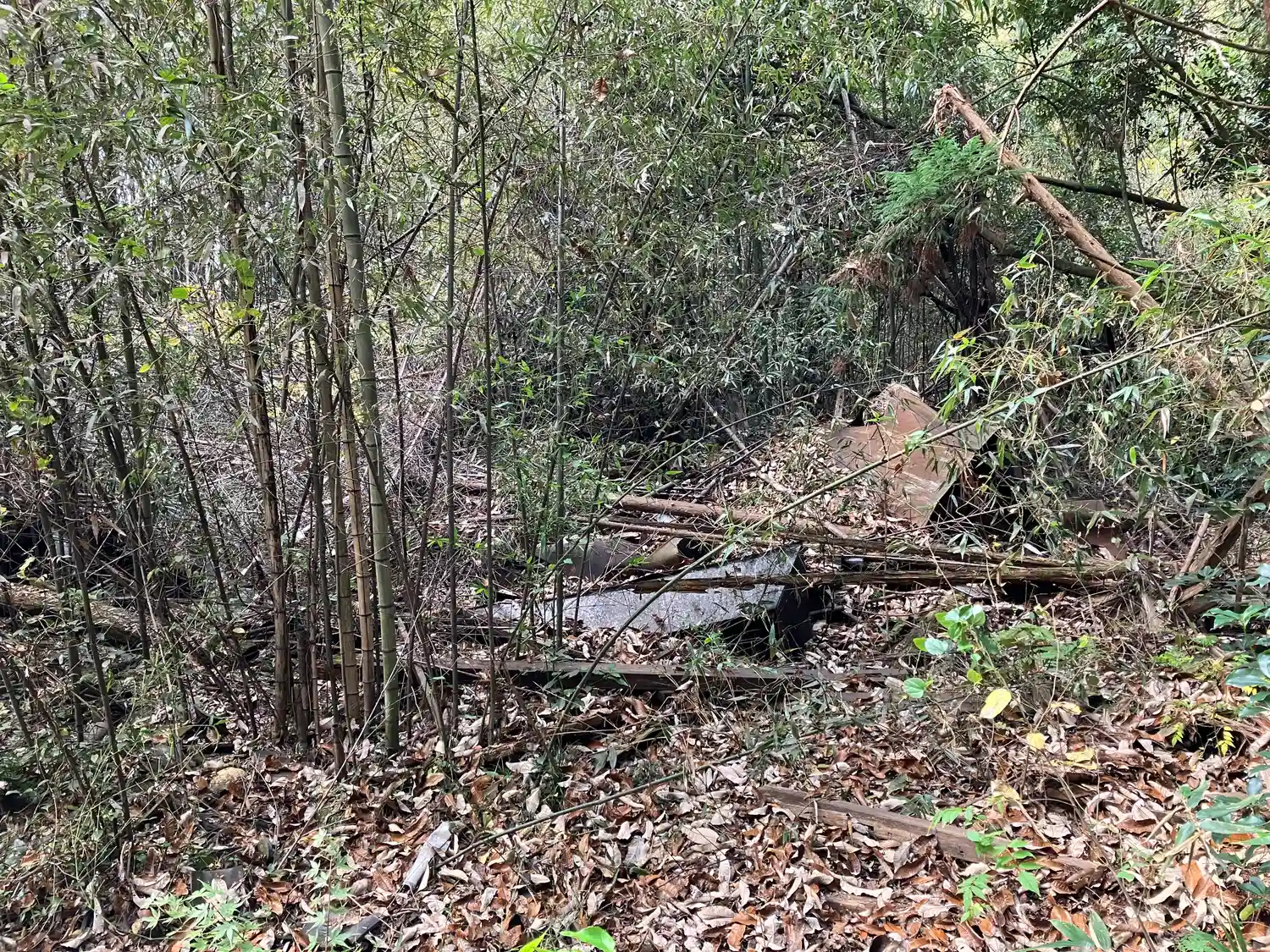 車が走れそうなギリギリの所まで行ってナビが示す方向へ歩を進めると朽ち果てた建物の跡が出てきた。どうやら間違いでは無かったようだが、境内と思われる場所は枯葉に覆われて自然に返りつつある。立入禁止のロープの先には建物が崩壊した跡が見て取れる。