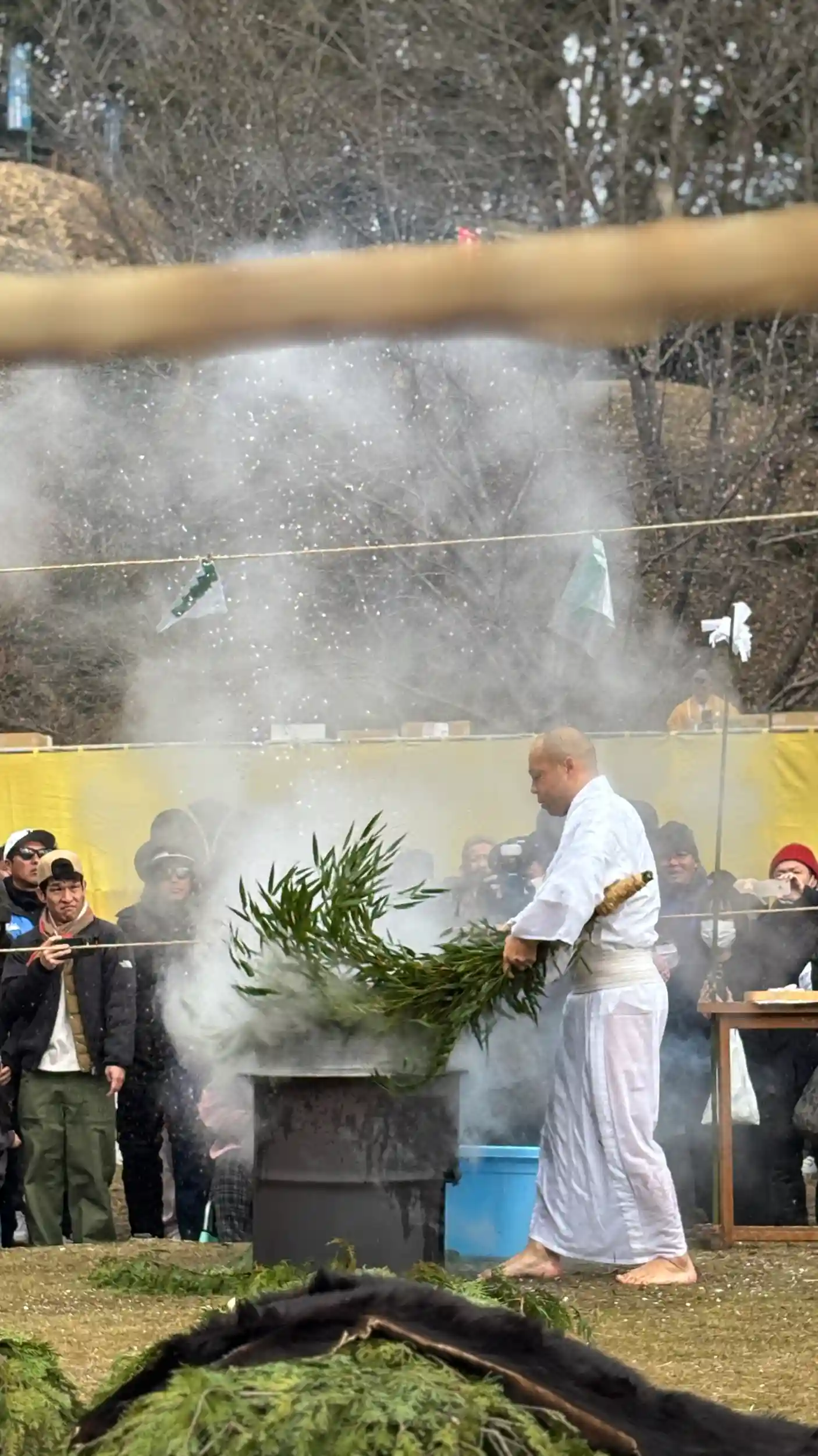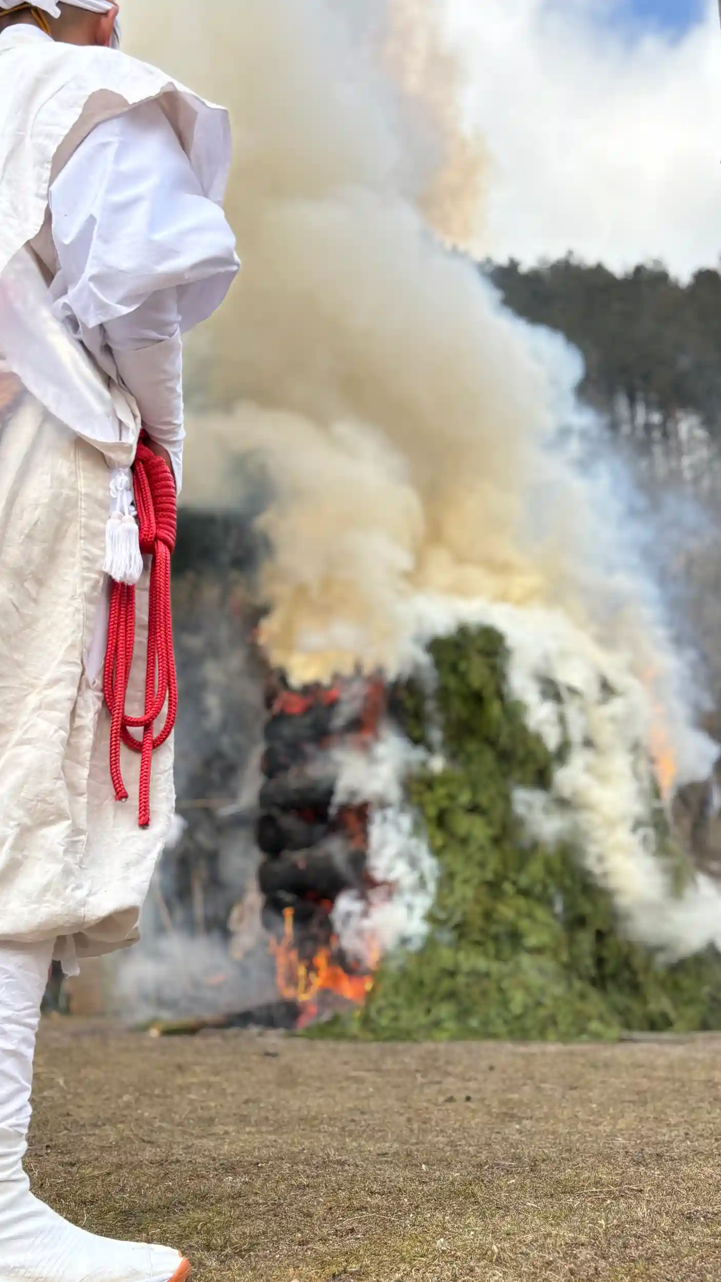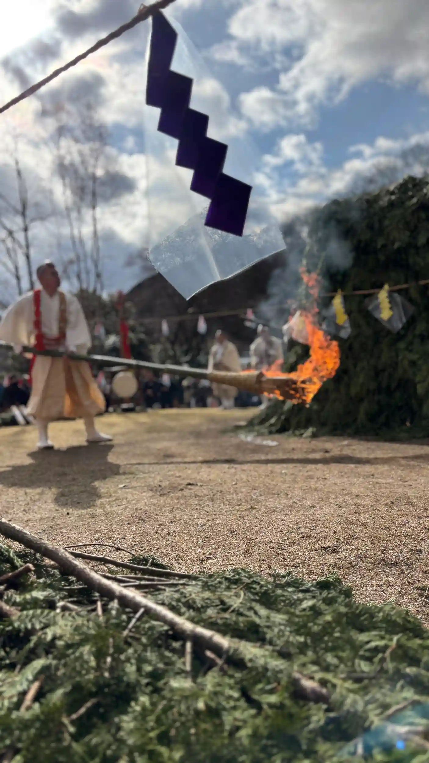 何人もの山伏さんがホラ貝を重奏し、柴燈大護祈が始まります。山となった杉の葉に火がつけられて、火柱がゴウゴウと立ち昇ったあとに出てきた丸太。それを火の上に渡して橋にし「火渡り」をします。