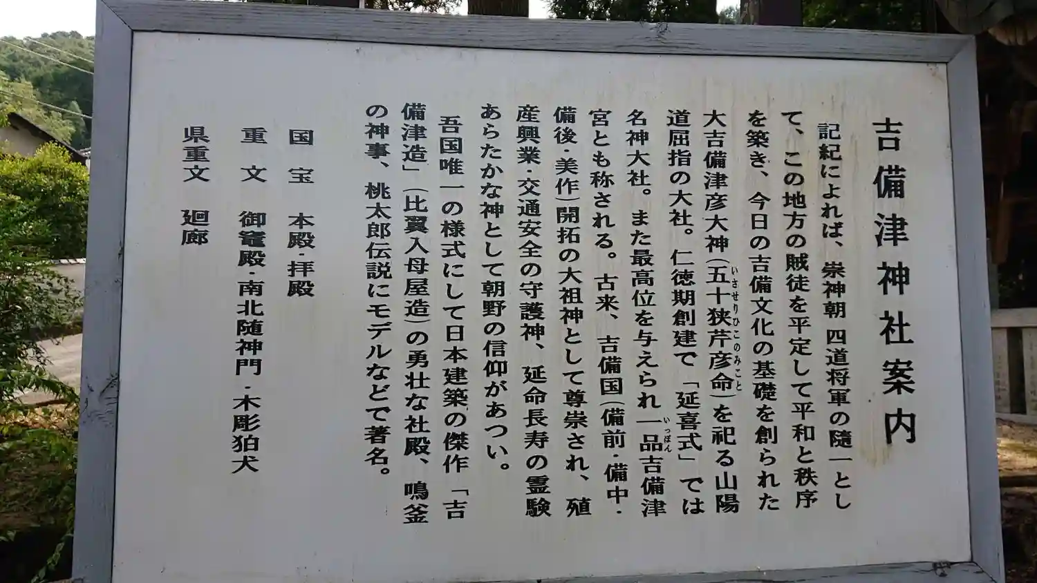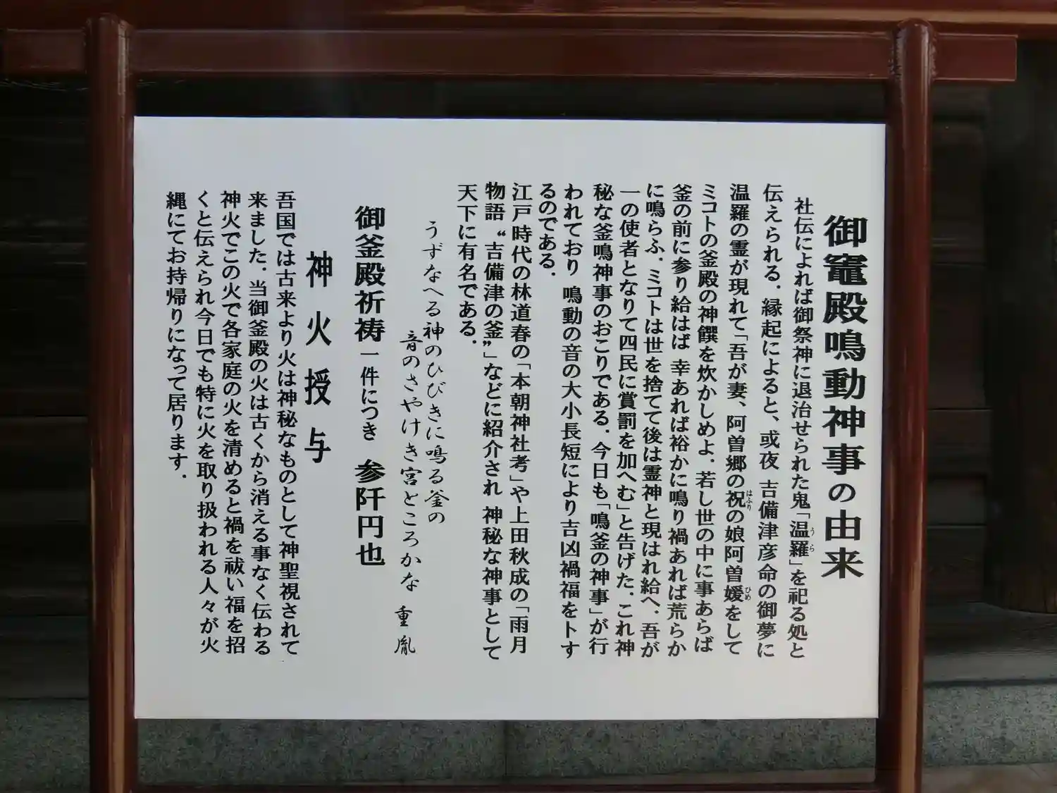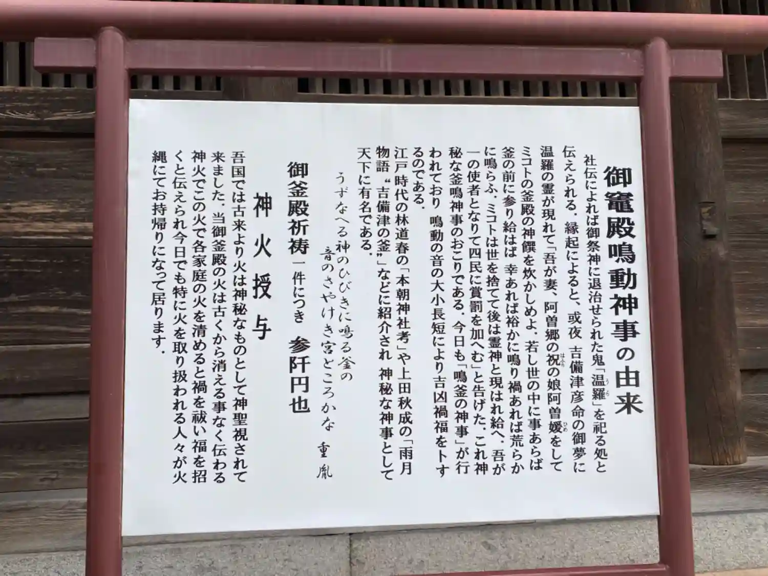 御由緒書きや吉備津神社の説明書きです。