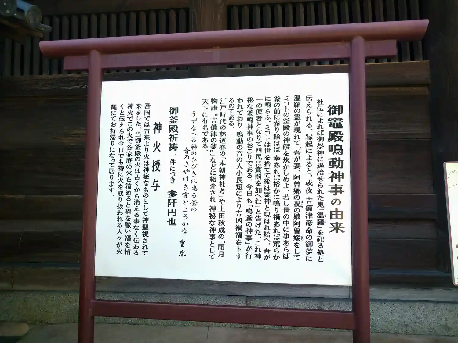 こちらは御釜殿で鳴釜神事というのがあるそうです。これは桃太郎伝説とも関係のある神事だそう。御釜殿に…
