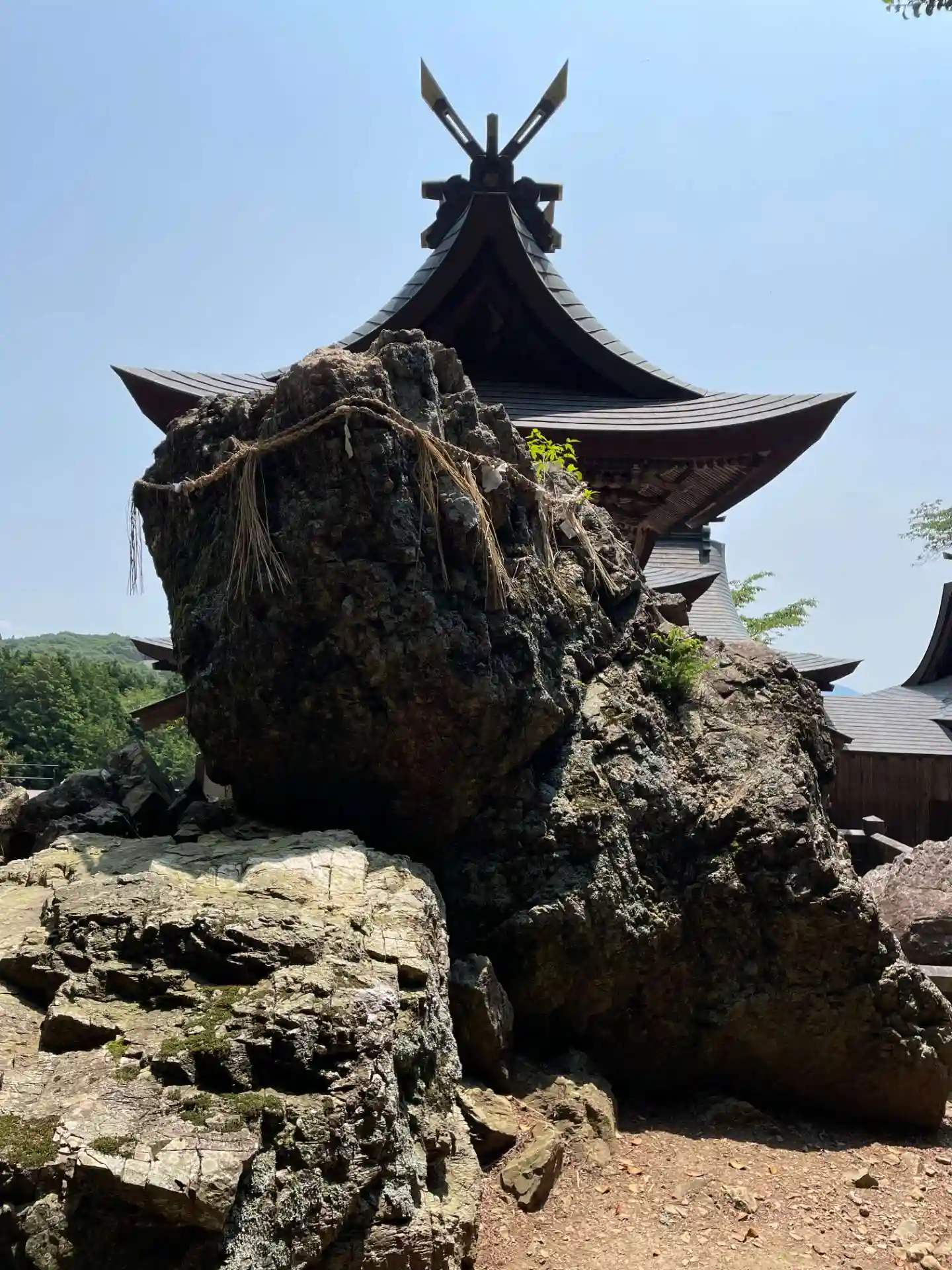 調べてみたところ 日本神話の神産みにおいてイザナギがカグツチの首を切り落とした際に十束剣「天之尾羽張(あめのおはばり)」の根元についた血が岩に飛び散って生まれた三神の一柱であるとのことで 岩を祀っているのかなあと思いました。