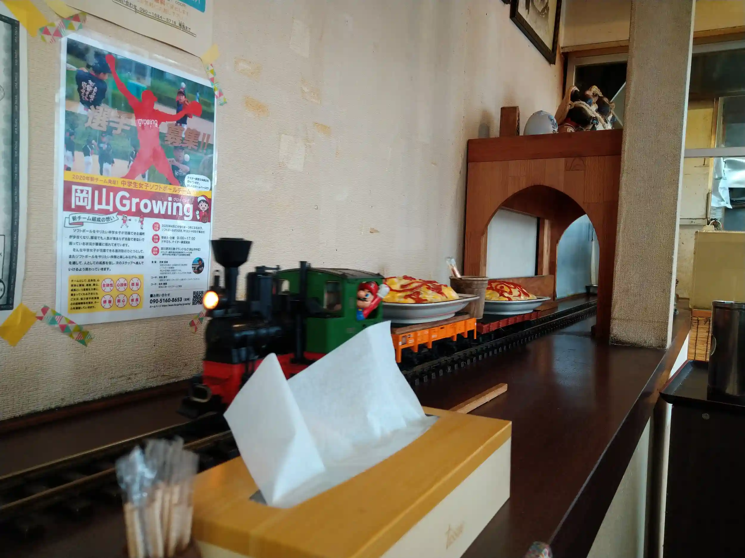 店内テーブル脇ににレールがあり、マリオを載せた汽車がお食事を運んでくれます😄