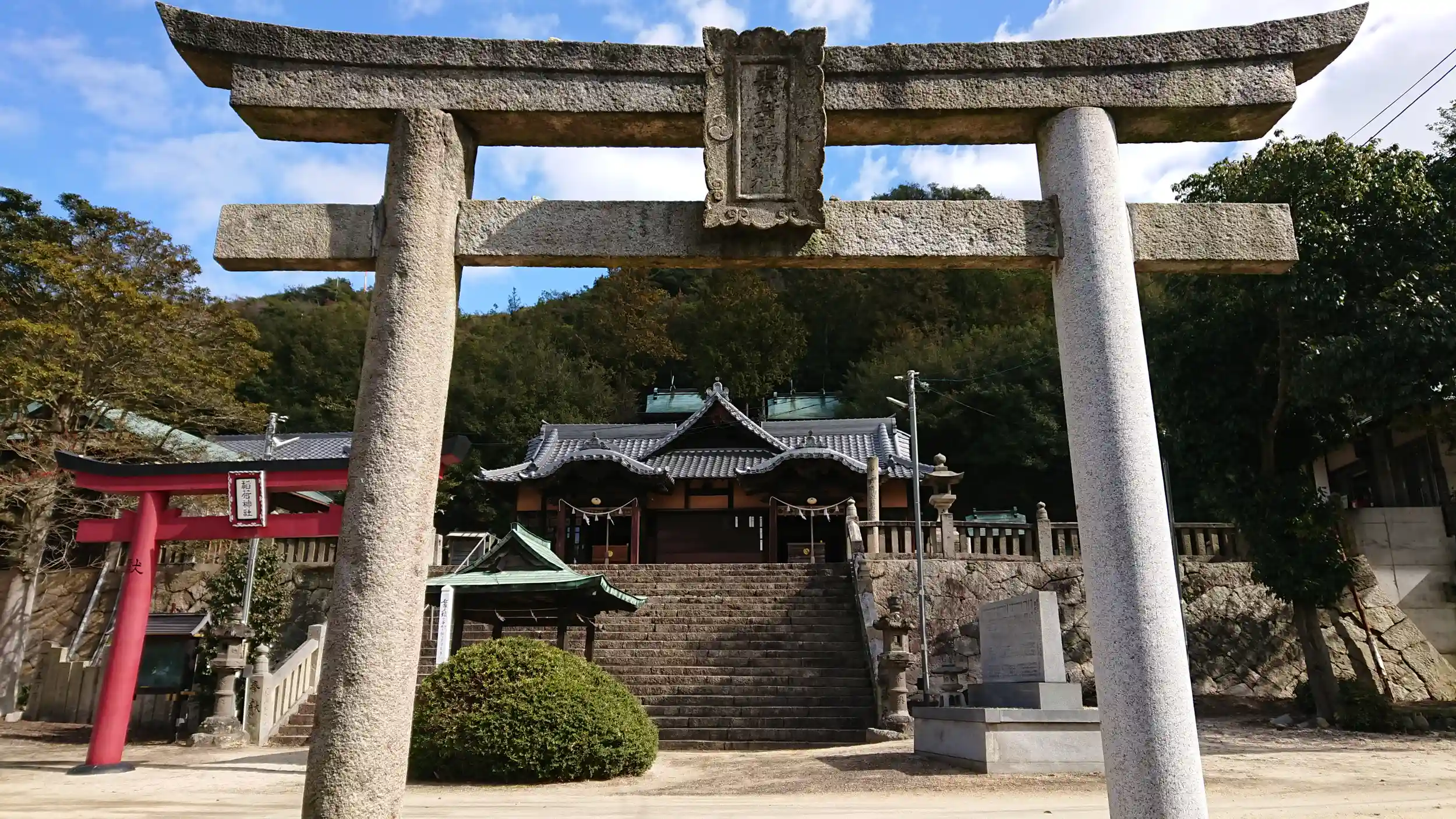 児島湾大橋からすぐ南に 飽浦稲荷宮と素盞鳴神社が、拝殿が繋がった造りで鎮座しています。歴史を見ると、先に素盞鳴神社が平安時代末期に源氏方の武将によって祀られていたようです。その後 鎌倉時代に飽浦稲荷宮が建立されています。江戸時代には このような拝殿が2つ繋がっている造りになっていたようです。手前には2つの鳥居が並び立っています。山と家々の境に静かに堂々と鎮座しているその姿は 独創性を感じて とても美しかったです。