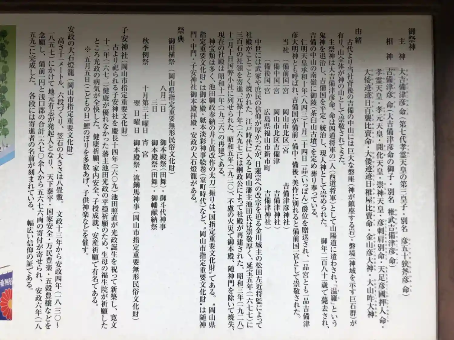 | ご祭神 | 《主祭神》 大吉備津日子大神 《配祀神》 吉備津彦命 孝霊天皇 孝元天皇 開化天皇 崇神天皇 天足彦国押人命 大倭迹迹日百襲比売命 大倭迹迹稚屋比売命 金山彦命 大山咋命 日子刺肩別命 | |