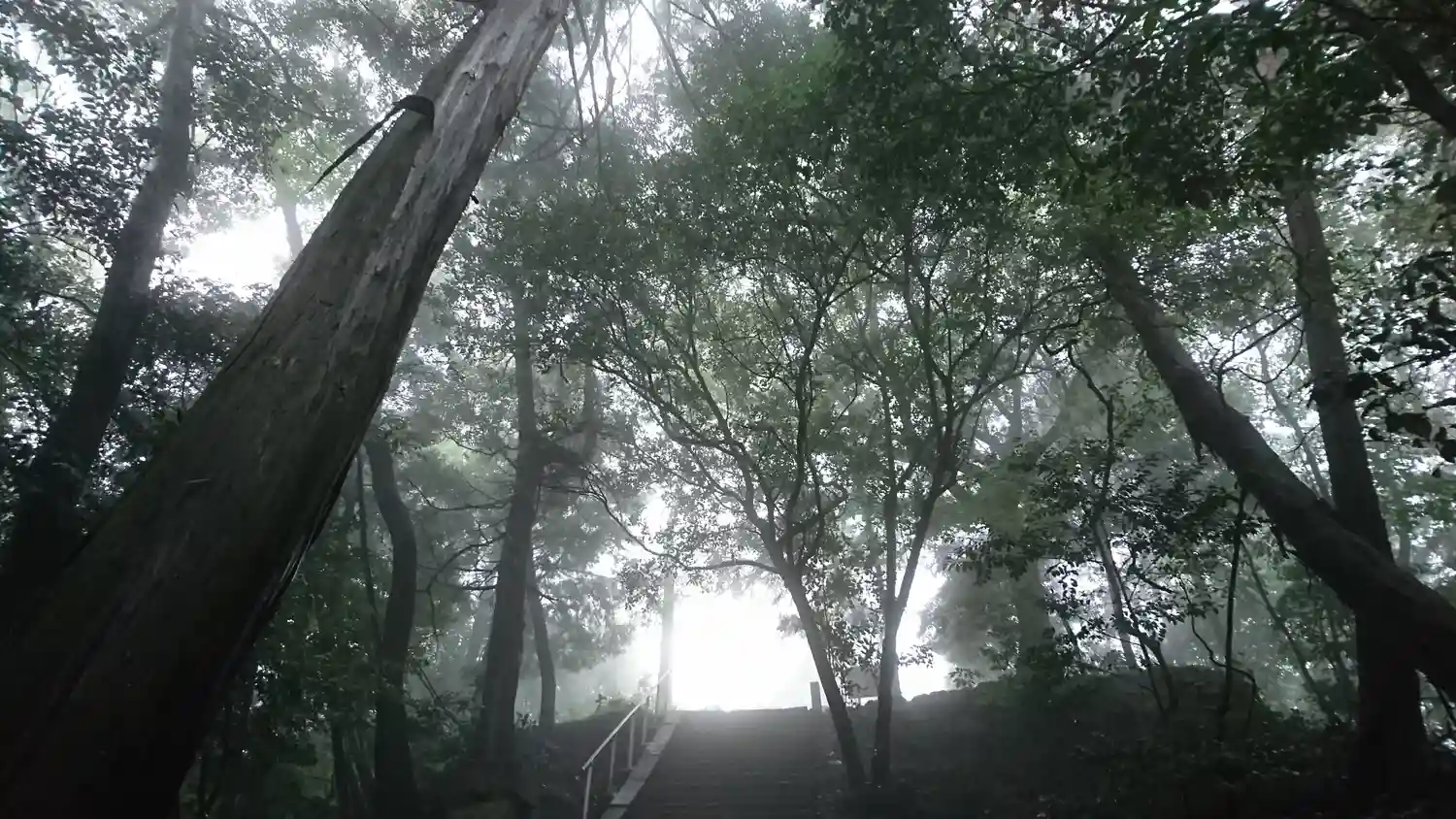 本殿脇から入り、急勾配の山道の先にある本宮へ。とても霧の濃い日の参拝でした。鳥居から見上げる 龍の…