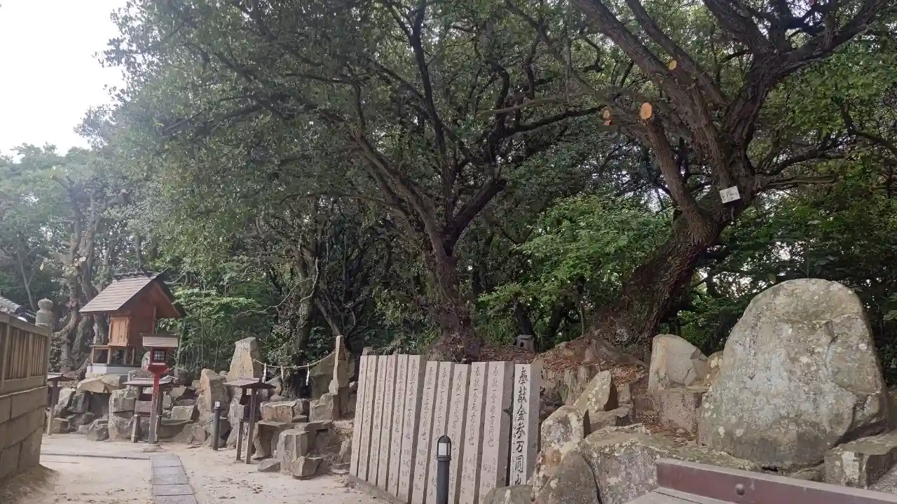こんもりとした山の上に位置するせいか、駐車場までの道はとても急斜面でしたが、境内から見る景色は絶景です。下に見える街並みは昔は海で、北側にある2号線バイパスは航路であったらしいのですが、今は立派な街が広がります。