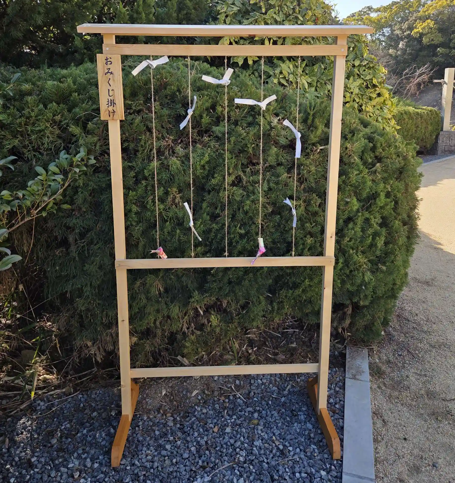 今まではサカキやカイヅカイブキにおみくじを結んでいただいておりましたが、おみくじを結ぶ専用のものがあればいいなとのご意見を賜りまして作製した次第です。