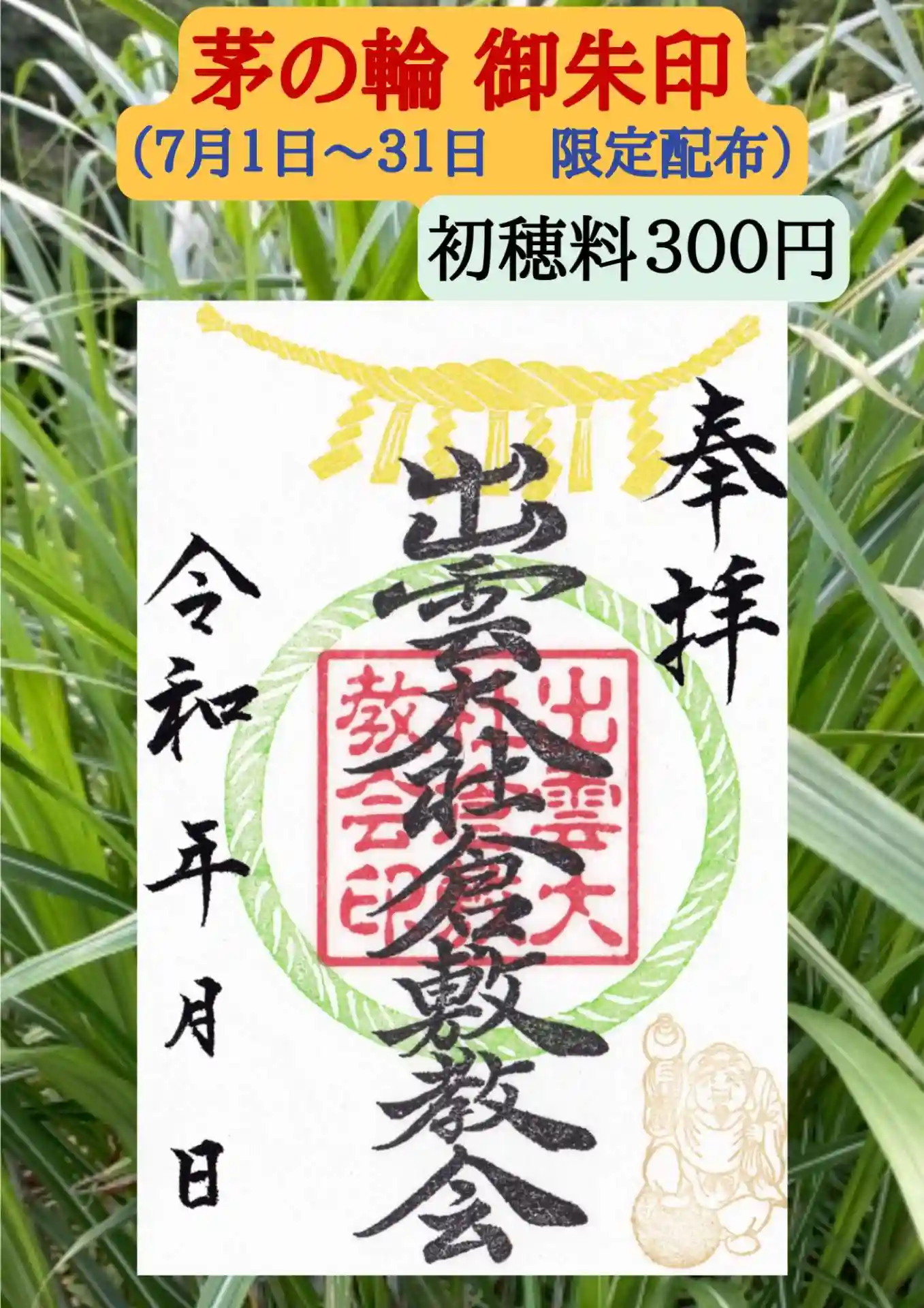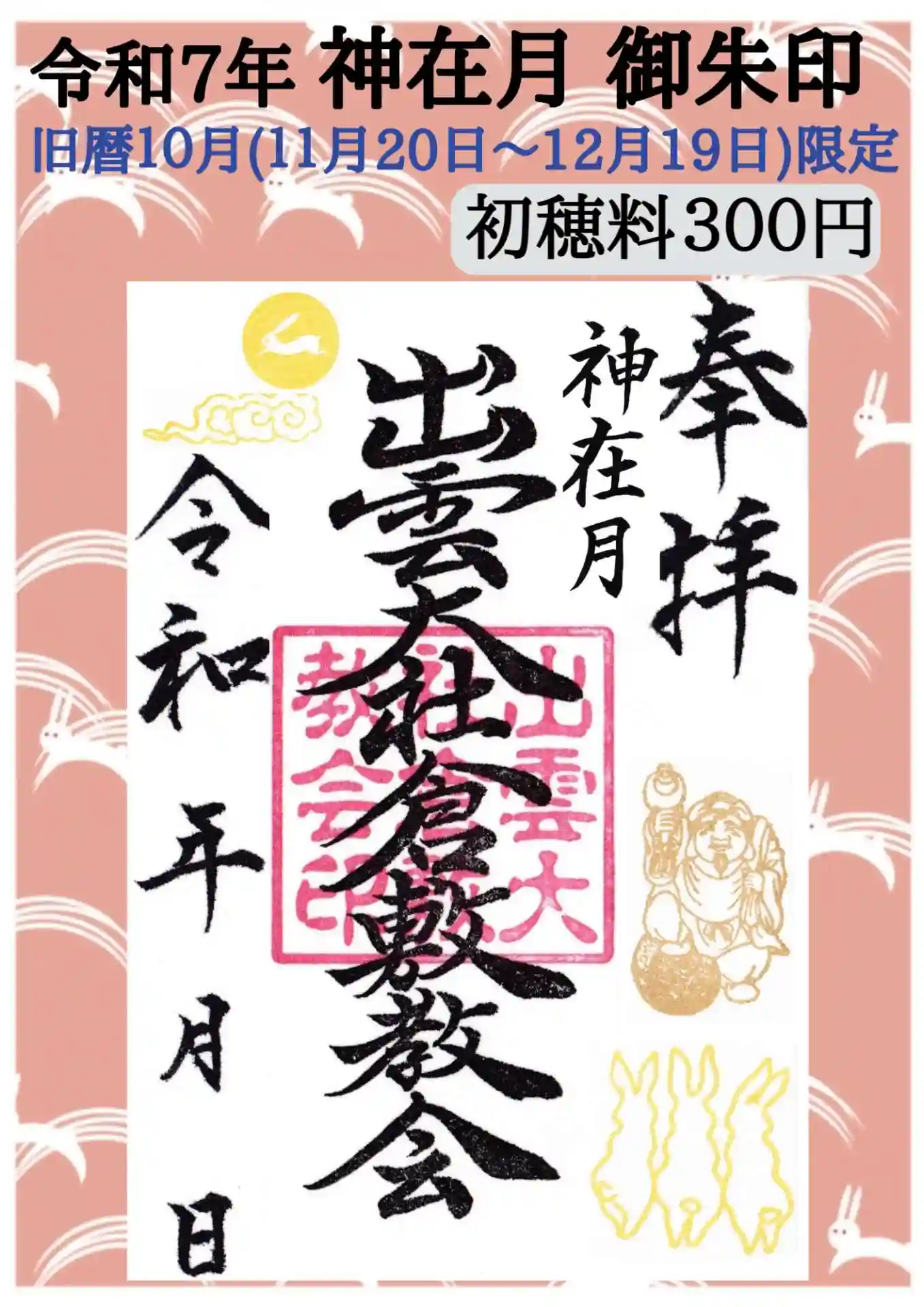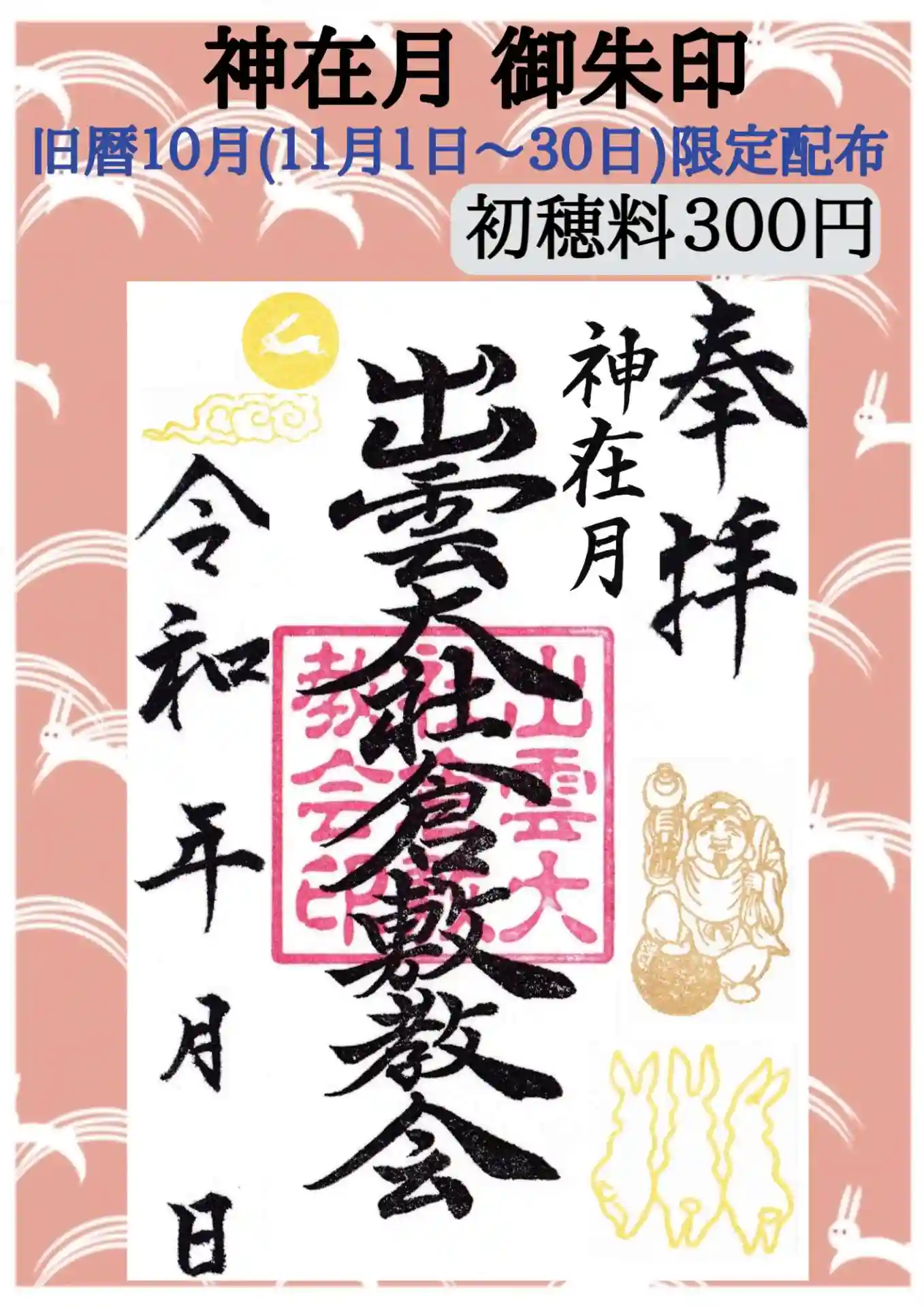 旧暦の10月は出雲では「神在月」と呼ばれます。それにちなんで出雲大社倉敷教会でも限定御朱印として特…
