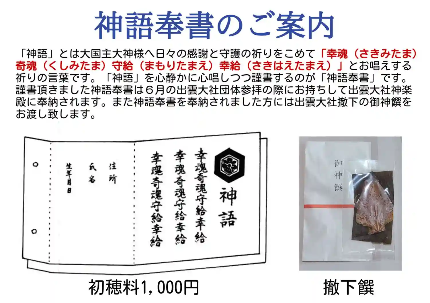 出雲大社倉敷教会では現在「福徳会」の申込を受付中です。