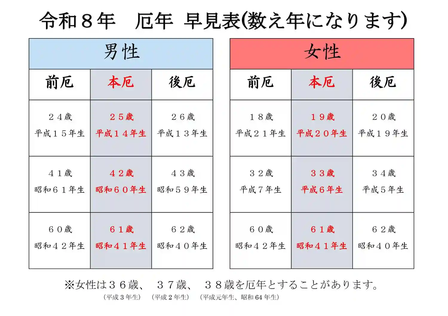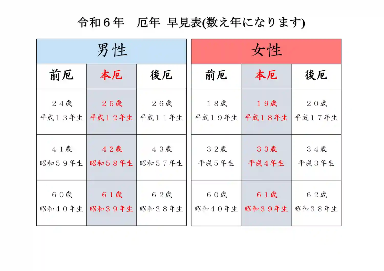 来年厄年の方が一目で分かる表を作成致しました。
