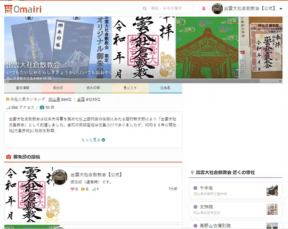 『みんなで作る神社お寺&御朱印ガイド』ことOmairi(おまいり)に出雲大社倉敷教会の投稿をしてく…