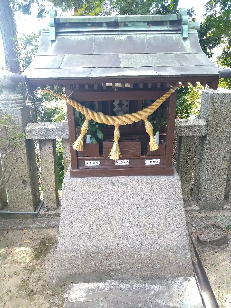 回廊左脇にあるこちらの社殿では、左から金光神社・和霊神社・箆取神社の神様を祀っています。