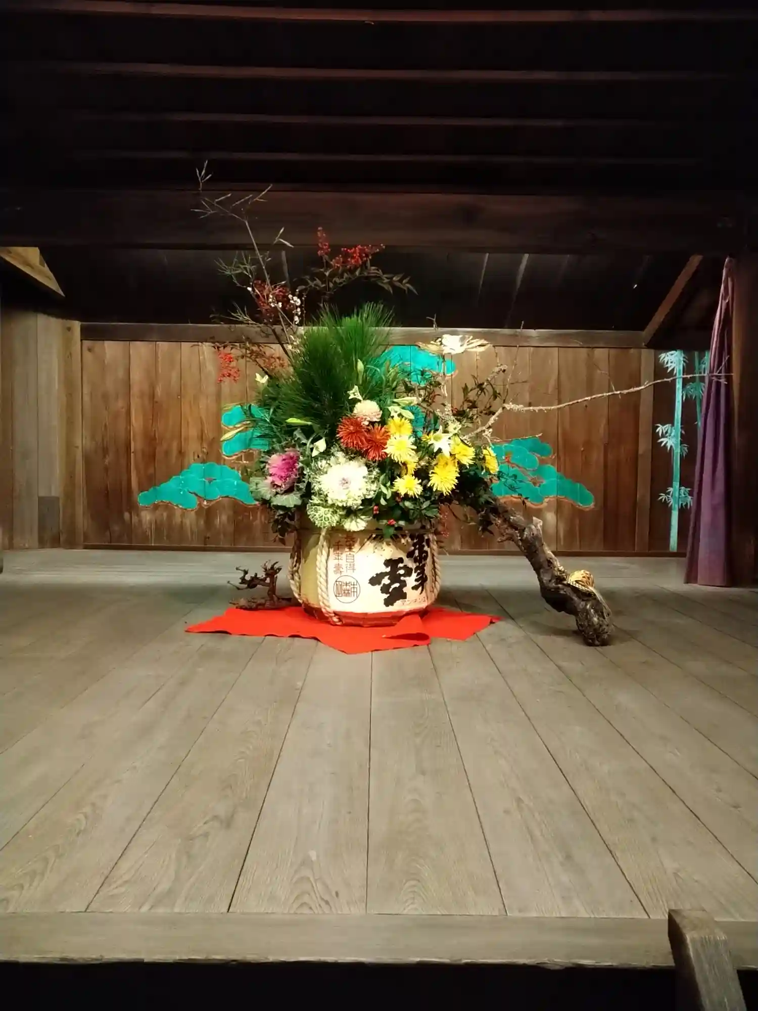 元旦の能舞台…酒樽に生けたお花が豪華です✨