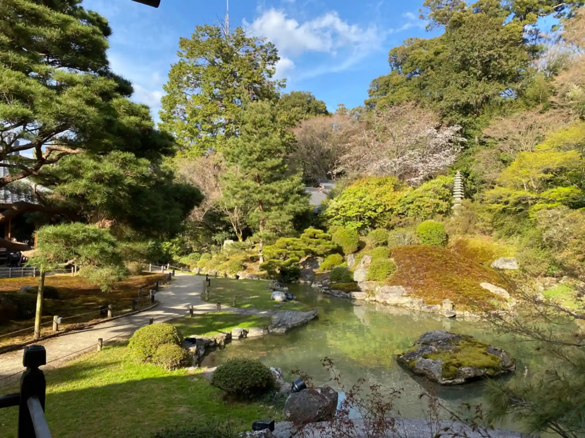室町時代に絵師として活躍した相阿弥の作と伝えられ、粟田山を借景に、その山裾を利用した池泉回遊式庭園😊
