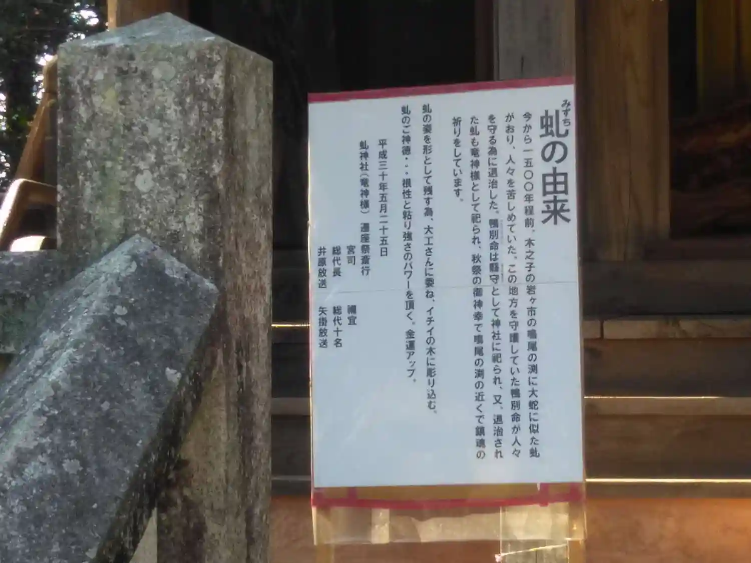 | ご由緒 | 創建年月日不詳だが、雄略天皇の御代に創まるという。口碑では祭神鴨別命が県守として居をこの地に占め給うたので、その徳を慕い県守大明神としたと伝えている。むかし、この地を県の郷と呼んでいる。明治四十四年無格社八幡神社を合祀した。大正九年五月神饌幣帛料供進神社に指定された。 |