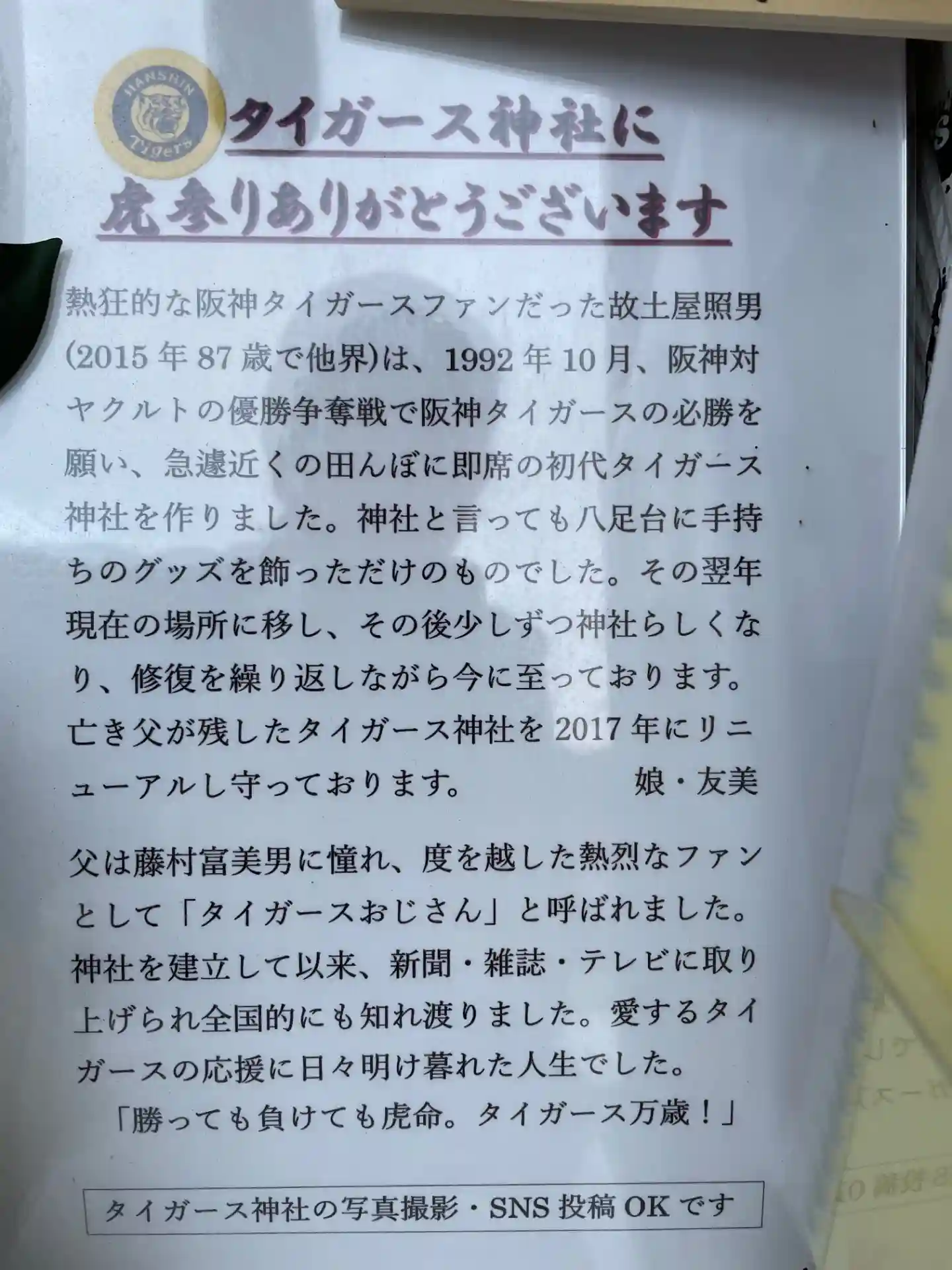 駅から30分歩いて、民家の敷地内にあるタイガース神社へ参拝⛩️
