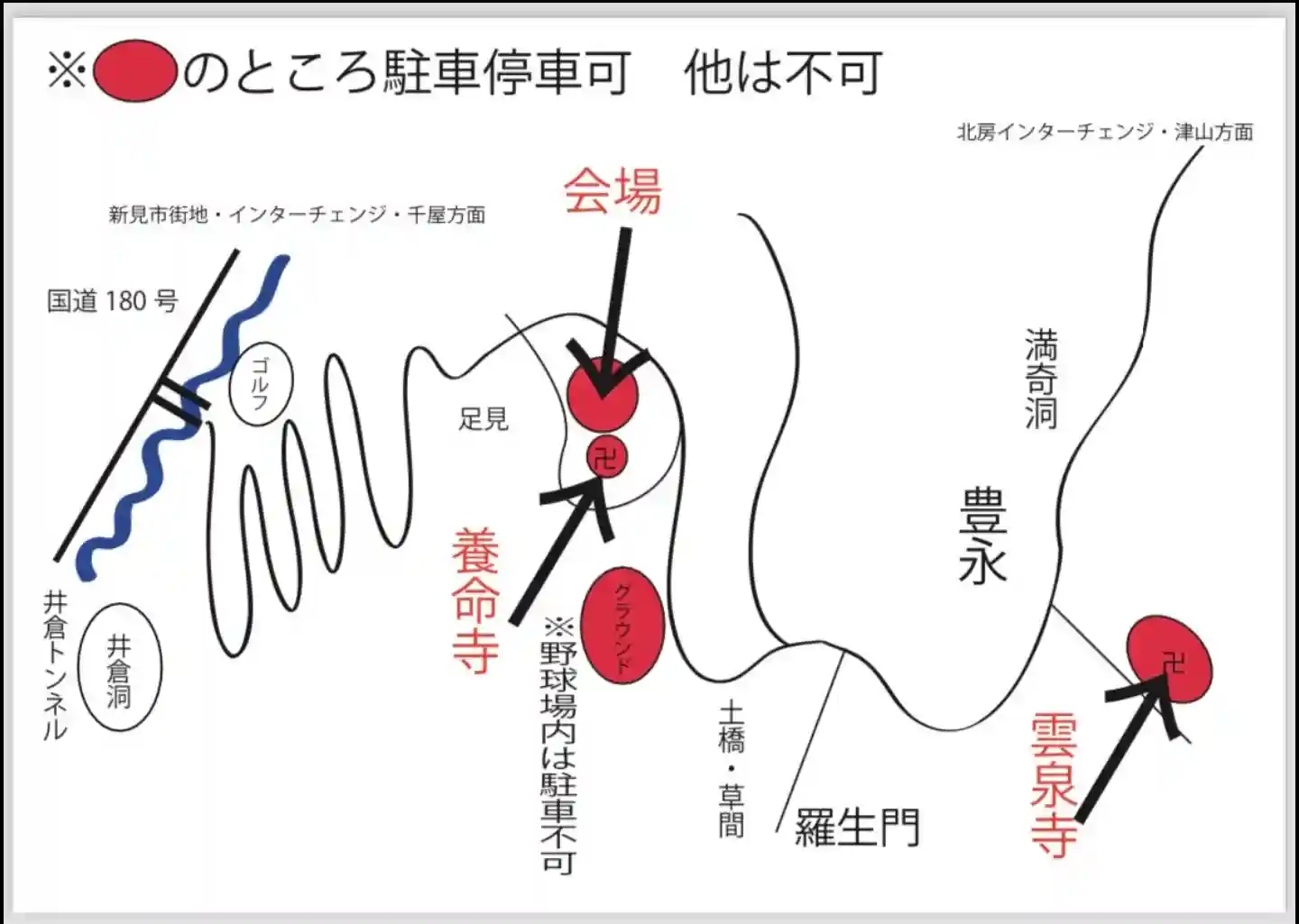 小学校の駐車場を開放いたしますのでそこに合わせてご来場ください。