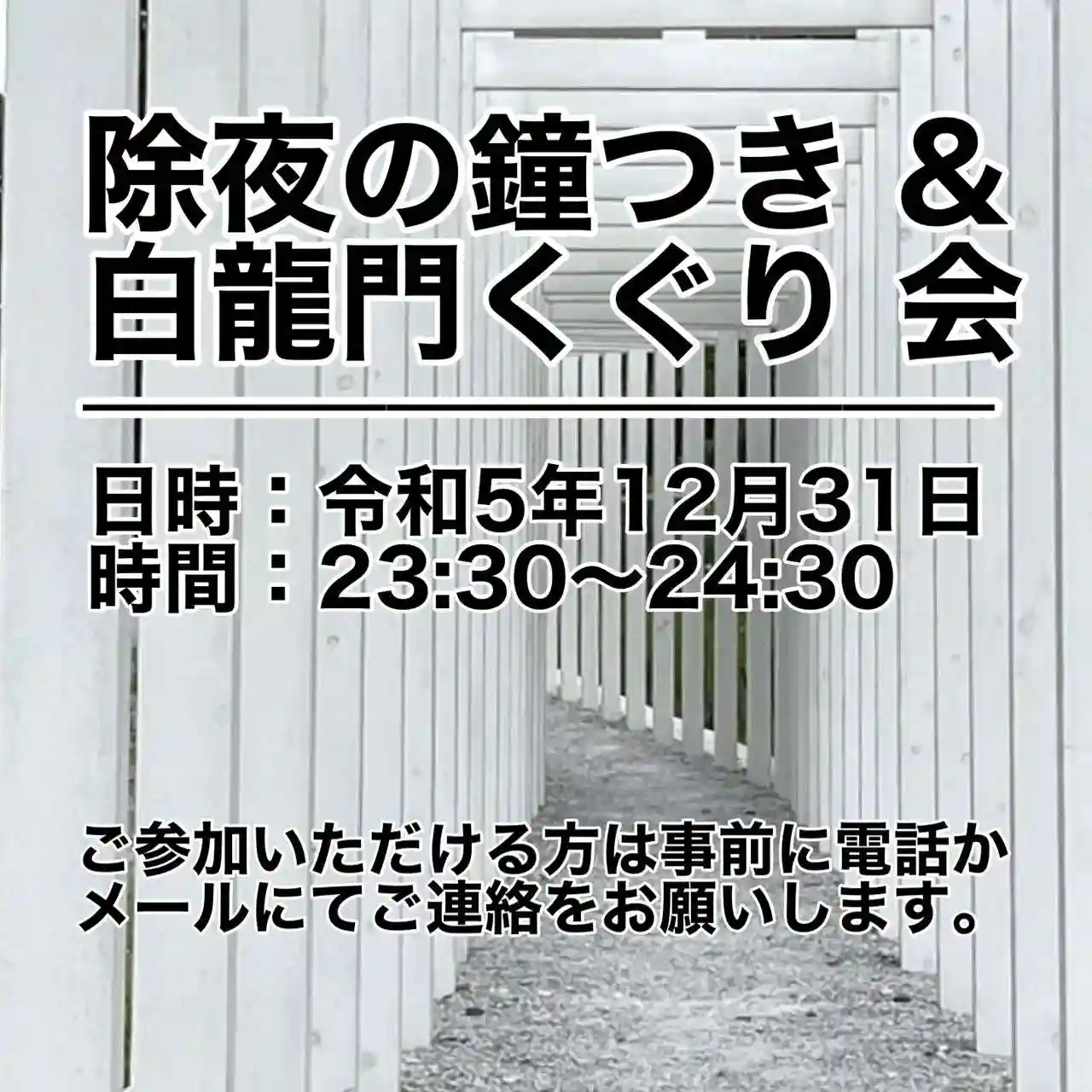 大晦日(12/31)の23時30分頃から24時30分頃にかけて「除夜の鐘つき&白龍門くぐり」会を小…