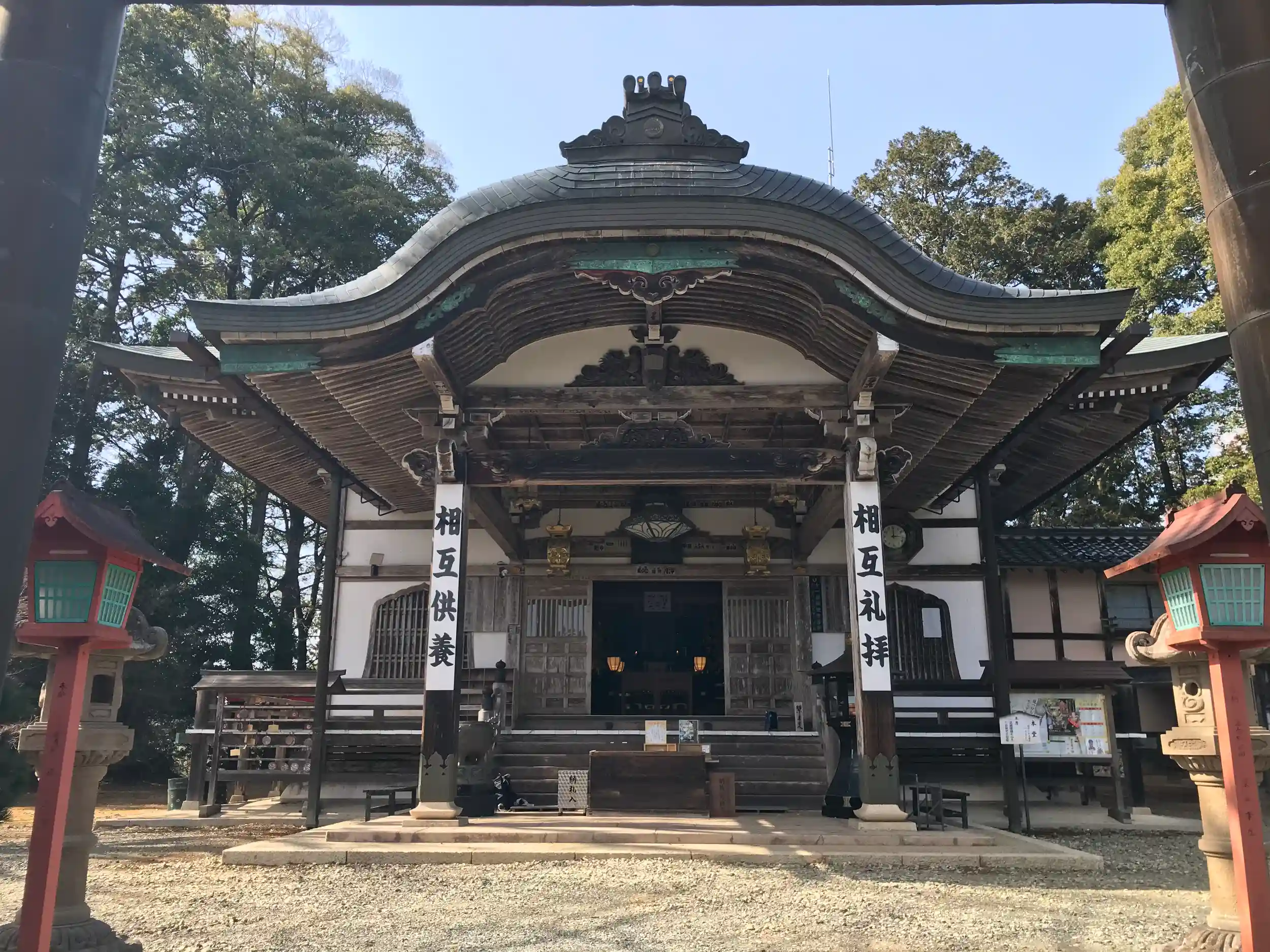 神仏習合の名残を残しており、山門の手前には鳥居が、本堂の裏手には鎮守殿が配されている。