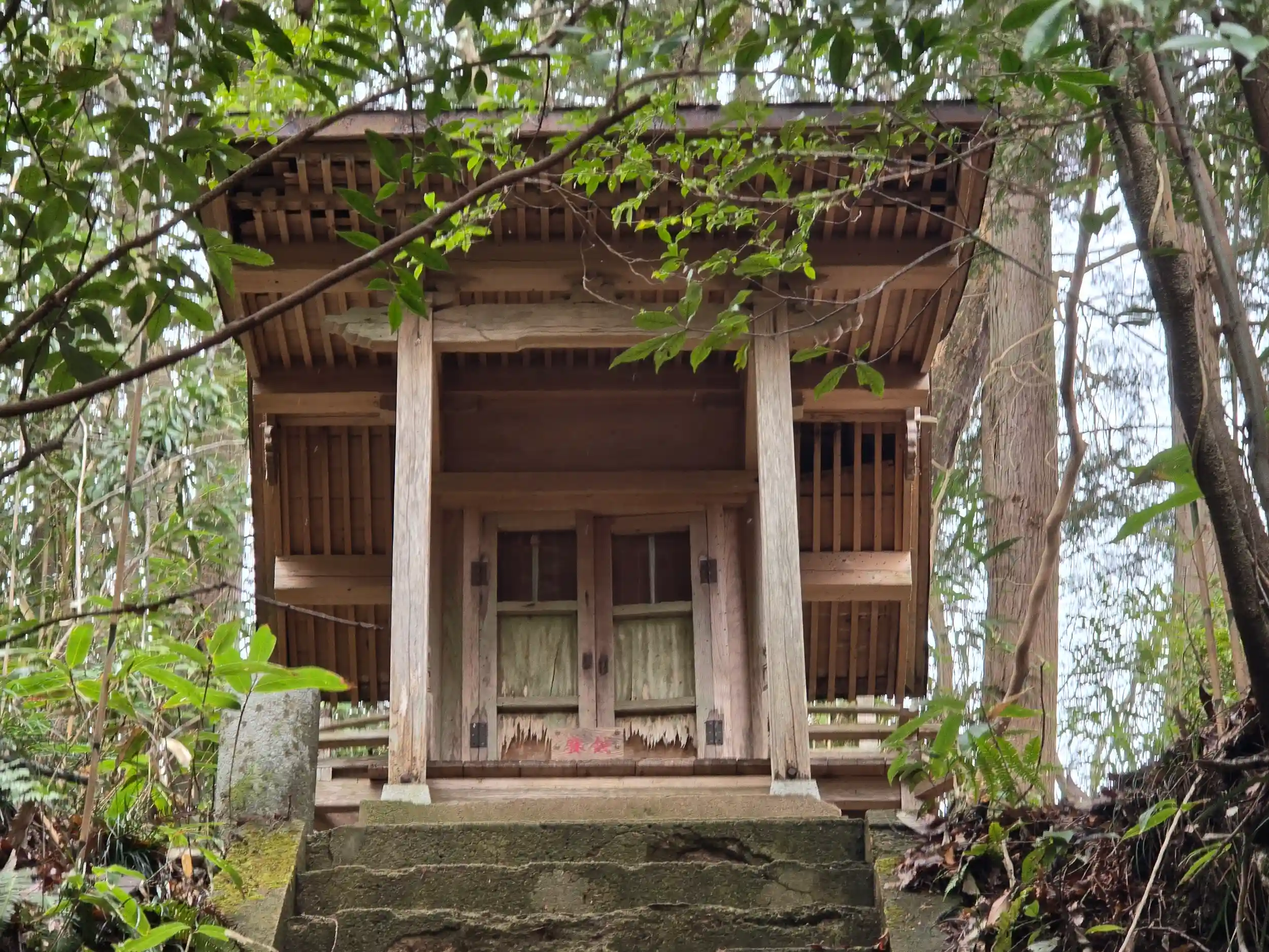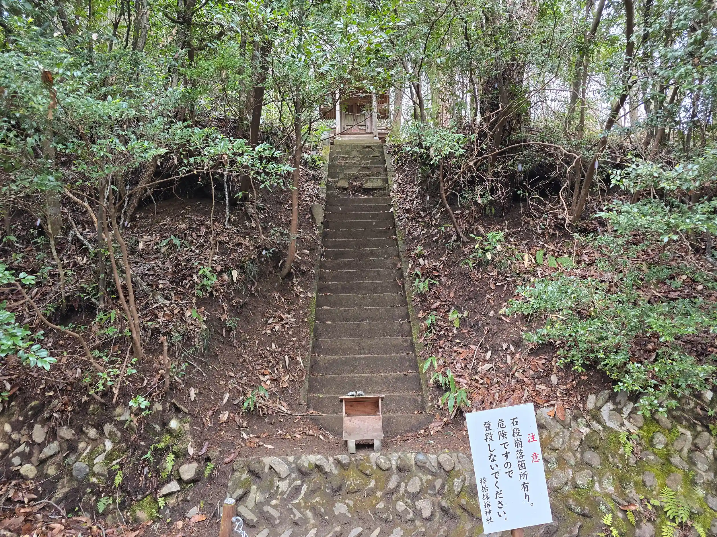 お社に向かう石段は少し崩れていて立ち入り禁止になっていました。やむなく、石段の下から手を合わせさせて頂きました(-人-)