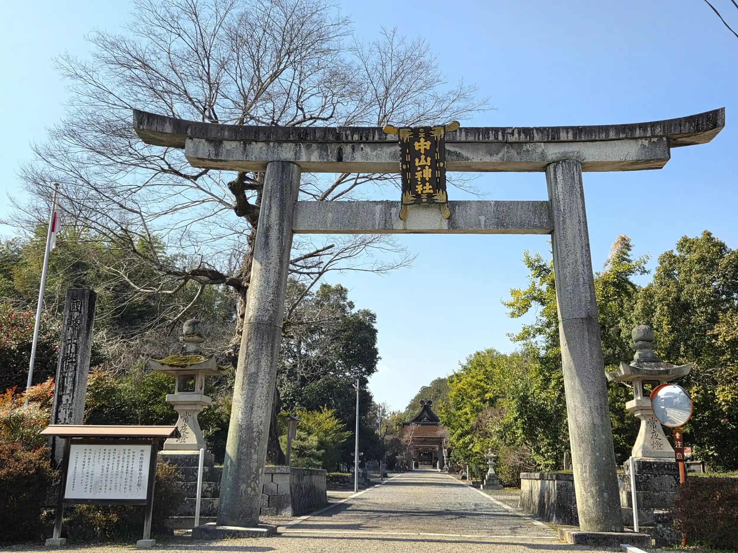 「鳥居は、角貫に木鼻がなく笠木と島木に反りをもたせてあり、他地方には例をみない中山鳥居として一形式をつくっています」