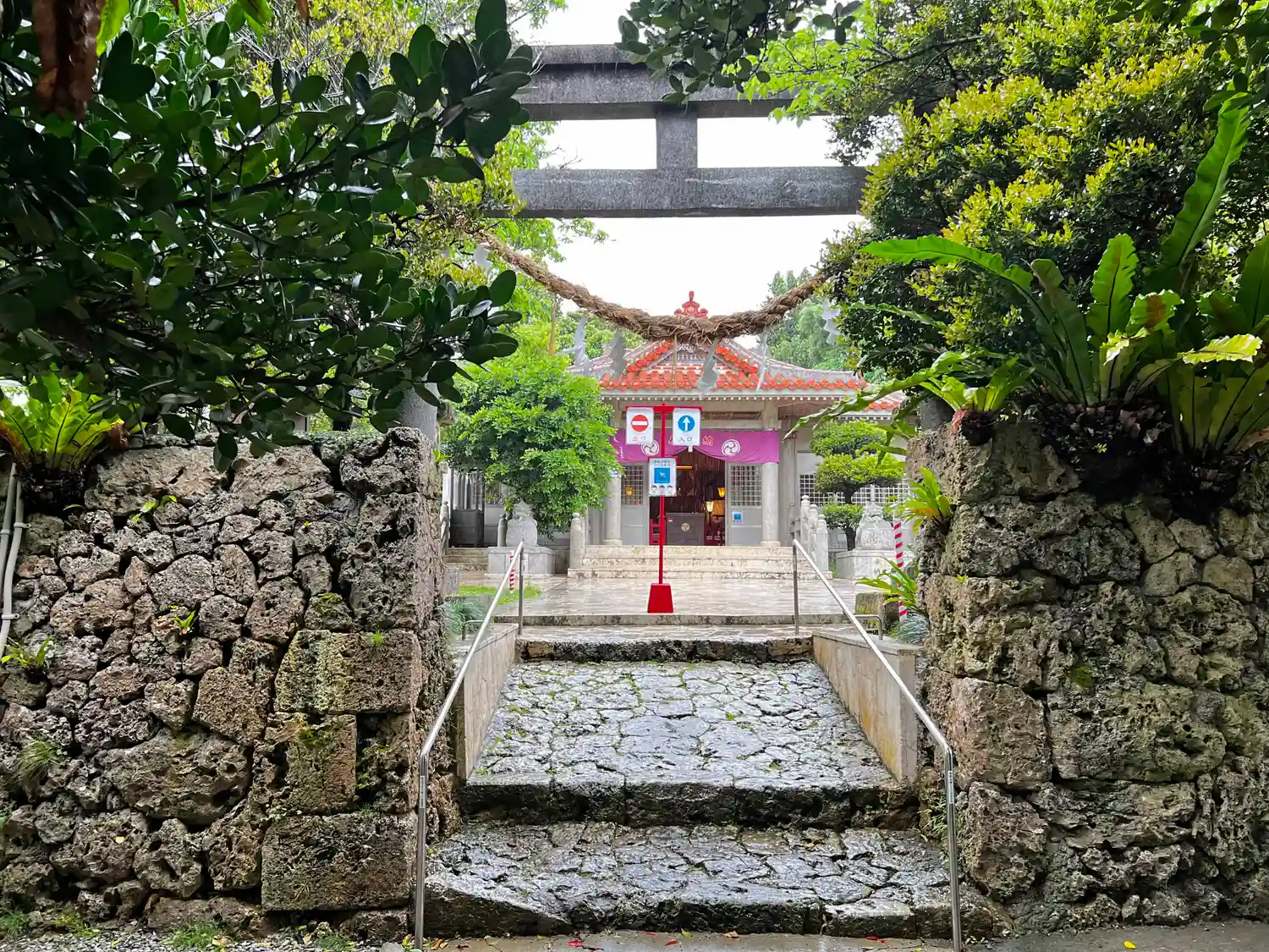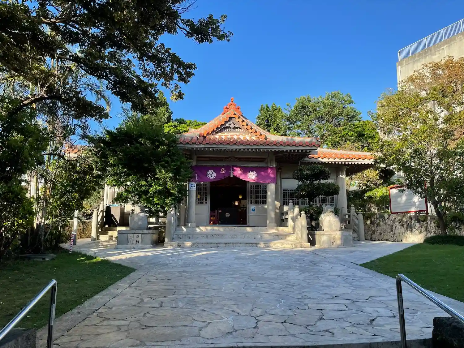 鳥居をくぐると、正面に<拝殿>全景。赤瓦に白い漆喰の、沖縄らしい造り。